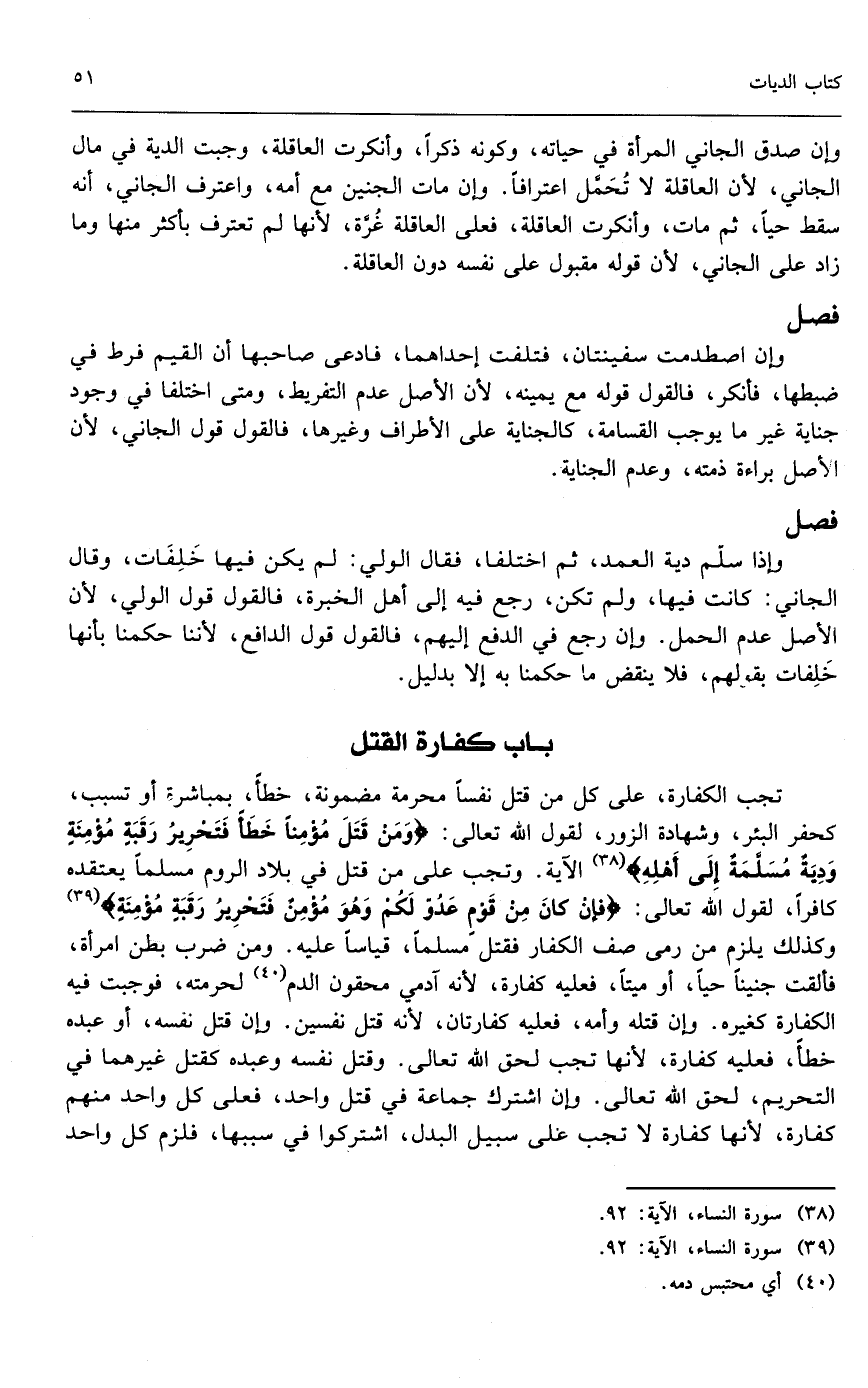 تجب الكفارة، على كل من قتل نفسًا محرمة مضمونة خطأ، بمباشرة أو تسبب، كحفر البئر، وشهادة الزور؛ لقول الله تعالى: {وَمَنْ قَتَلَ مُؤْمِنًا خَطَأً فَتَحْرِيرُ رَقَبَةٍ مُؤْمِنَةٍ وَدِيَةٌ مُسَلَّمَةٌ إِلَى أَهْلِهِ} [النساء: 92] ، وتجب على من قتل في بلاد الروم مسلمًا يعتقده كافرًا؛ لقول الله تعالى: {فَإِنْ كَانَ مِنْ قَوْمٍ عَدُوٍّ لَكُمْ وَهُوَ مُؤْمِنٌ فَتَحْرِيرُ رَقَبَةٍ مُؤْمِنَةٍ} [النساء: 92] ، وكذلك يلزم من رمى صف الكفار فقتل مسلمًا، قياسًا عليه، ومن ضرب بطن امرأة، فألقت جنينًا حيًا أو ميتًا، فعليه كفارة؛ لأنه آدمي محقون الدم لحرمته، فوجبت فيه الكفارة كغيره، وإن قتله وأمه، فعليه كفارتان؛ لأنه قتل نفسين، وإن قتل نفسه أو عبده خطأ، فعليه كفارة؛ لأنها تجب لحق الله تعالى، وقتل نفسه وعبده كقتل غيرهما في التحريم، لحق الله تعالى، وإن اشترك جماعة في قتل واحد، فعلى كل واحد منهم كفارة؛ لأنها كفارة لا تجب على سبيل البدل، اشتركوا في سببها فلزم كل واحد