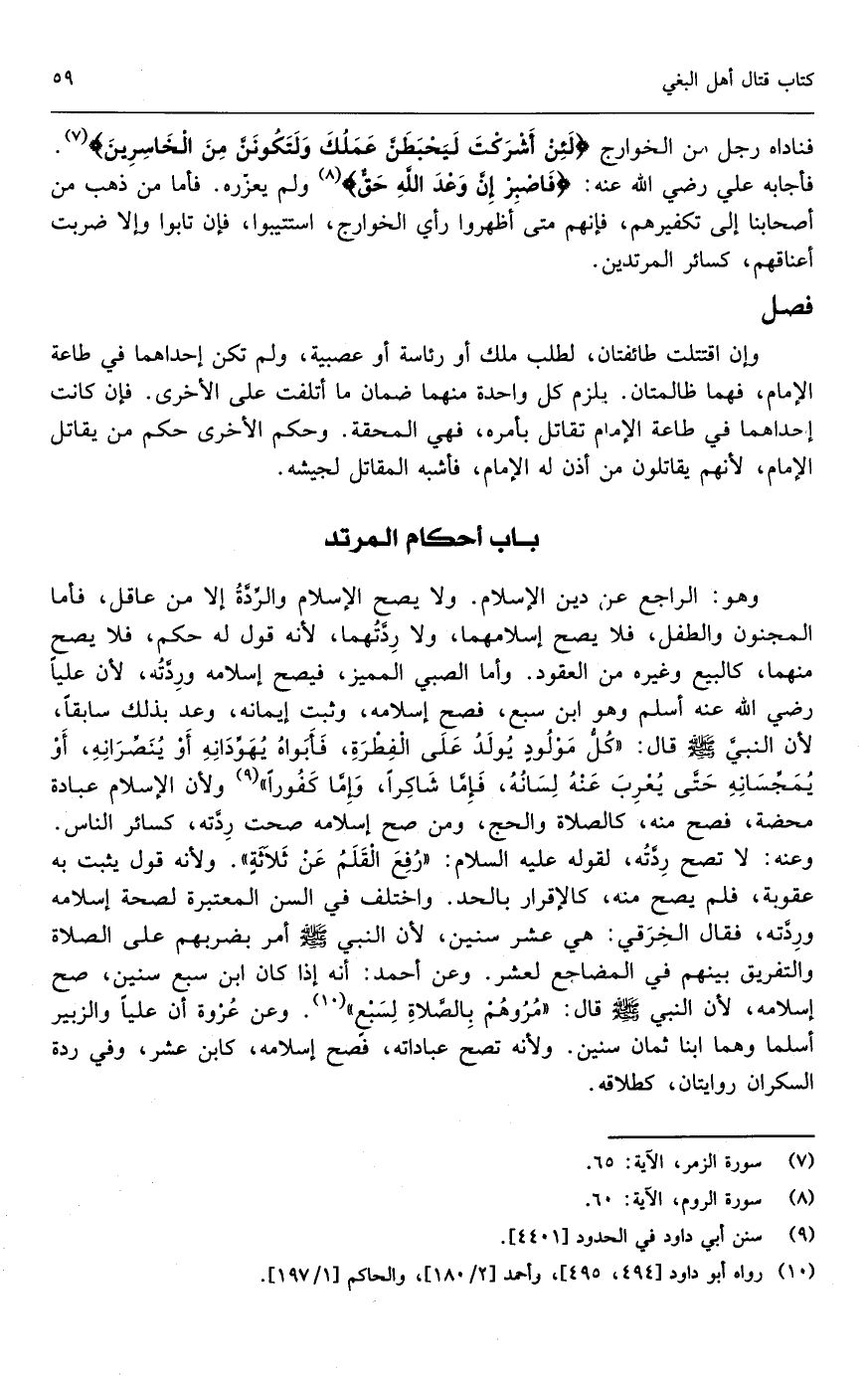 فناداه رجل من الخوارج: {لَئِنْ أَشْرَكْتَ لَيَحْبَطَنَّ عَمَلُكَ وَلَتَكُونَنَّ مِنَ الْخَاسِرِينَ} [الزمر: 65] ، فأجابه علي - رَضِيَ اللَّهُ عَنْهُ -: {فَاصْبِرْ إِنَّ وَعْدَ اللَّهِ حَقٌّ} [الروم: 60] ولم يعزره، فأما من ذهب من أصحابنا إلى تكفيرهم، فإنهم متى أظهروا رأي الخوارج استتيبوا، فإن تابوا وإلا ضربت أعناقهم، كسائر المرتدين.