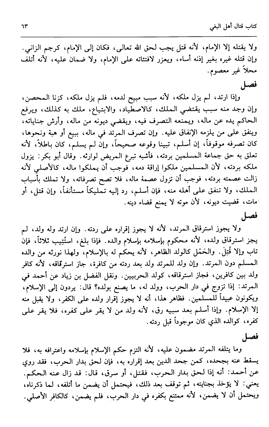 وإذا ارتد، لم يزل ملكه؛ لأنه سبب مبيح لدمه، فلم يزل ملكه، كزنا المحصن، وإن وجد منه سبب يقتضي الملك، كالاصطياد، والابتياع، ملك به كذلك، ويرفع الحاكم يده عن ماله، ويمنعه التصرف فيه، ويقضي ديونه من ماله، وأرش جناياته، وينفق على من يلزمه الإنفاق عليه، وإن تصرف المرتد في ماله، ببيع أو هبة ونحوها، كان تصرفه موقوفًا، إن أسلم تبينا وقوعه صحيحًا، وإن لم يسلم كان باطلًا؛ لأنه تعلق به حق جماعة المسلمين بردته، فأشبه تبرع المريض لوارثه، وقال أبو بكر: يزول ملكه بردته؛ لأن المسلمين ملكوا إراقة دمه، فوجب أن يملكوا ماله كالأصلي؛ لأنه زالت عصمته بردته، فوجب أن تزول عصمة ماله، فلا تصح تصرفاته، ولا تملك بأسباب الملك، ولا تنفق على أهله منه، فإن أسلم رد إليه تمليكًا مستأنفًا، وإن قتل أو مات قُضيت ديونه؛ لأن موته لا يمنع قضاء دينه.