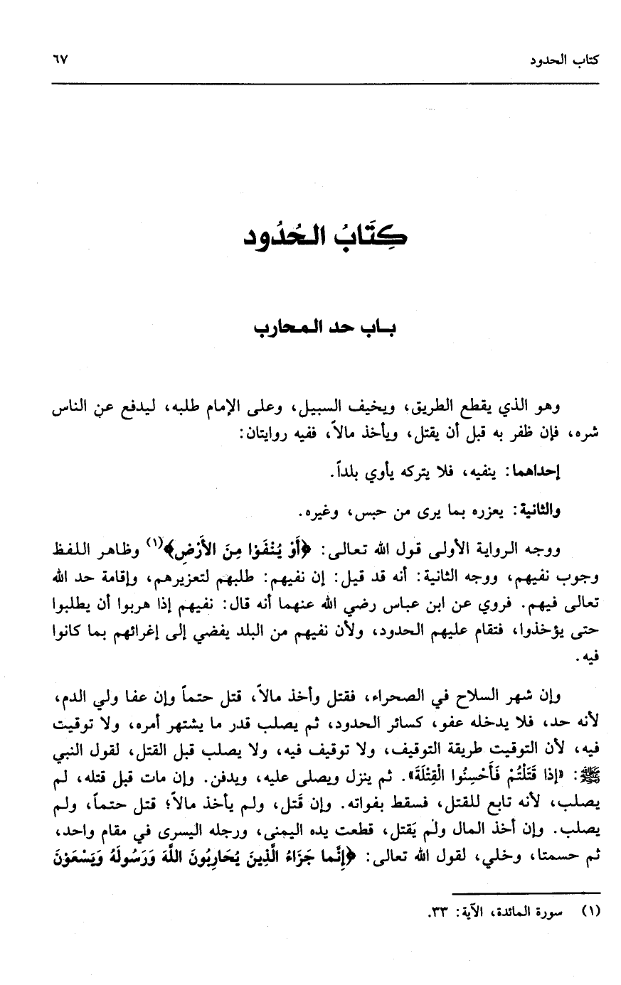 كتاب الحدود باب حد المحارب وهو الذي يقطع الطريق، ويخيف السبيل، وعلى الإمام طلبه؛ ليدفع عن الناس شره، فإن ظفر به قبل أن يقتل، ويأخذ مالاً، ففيه روايتان: