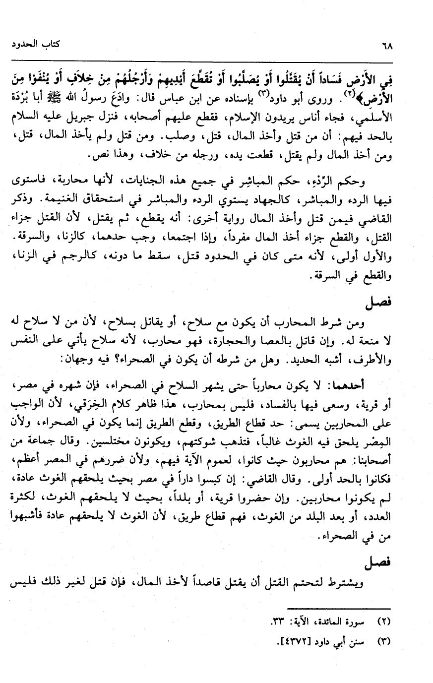 وروى أبو داود بإسناده عن ابن عباس قال: «وادع رسول الله - صَلَّى اللَّهُ عَلَيْهِ وَسَلَّمَ - أبا بردة الأسلمي، فجاء أناس يريدون الإسلام، فقطع عليهم أصحابه، فنزل جبريل - عَلَيْهِ السَّلَامُ - بالحد فيهم: أن من قتل وأخذ المال، قتل وصلب. ومن قتل ولم يأخذ المال، قتل، ومن أخذ المال ولم يقتل، قطعت يده ورجله من خلاف» ، وهذا نص.