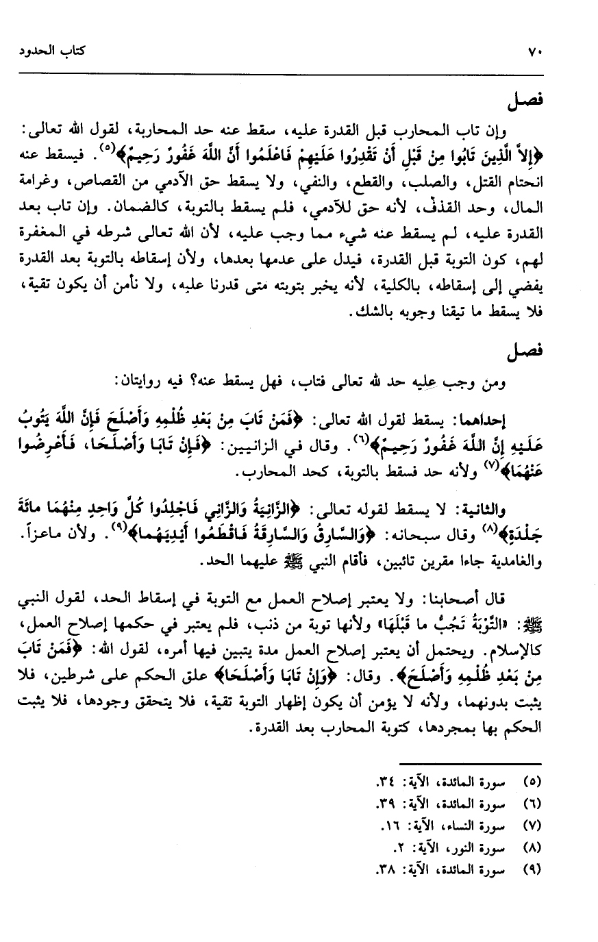 وإن تاب المحارب قبل القدرة عليه، سقط عنه حد المحاربة؛ لقول الله تعالى: {إِلا الَّذِينَ تَابُوا مِنْ قَبْلِ أَنْ تَقْدِرُوا عَلَيْهِمْ فَاعْلَمُوا أَنَّ اللَّهَ غَفُورٌ رَحِيمٌ} [المائدة: 34] . فيسقط عنه انحتام القتل، والصلب، والقطع، والنفي، ولا يسقط حق الآدمي من القصاص، وغرامة المال، وحد القذف؛ لأنه حق للآدمي، فلم يسقط بالتوبة، كالضمان. وإن تاب بعد القدرة عليه، لم يسقط عنه شيء مما وجب عليه؛ لأن الله تعالى شرطه في المغفرة لهم، كون التوبة قبل القدرة، فيدل على عدمها بعدها، ولأن إسقاطه بالتوبة بعد القدرة يفضي إلى إسقاطه بالكلية؛ لأنه يخبر بتوبته متى قدرنا عليه، ولا نأمن أن يكون تقية، فلا يسقط ما تيقنا وجوبه بالشك.