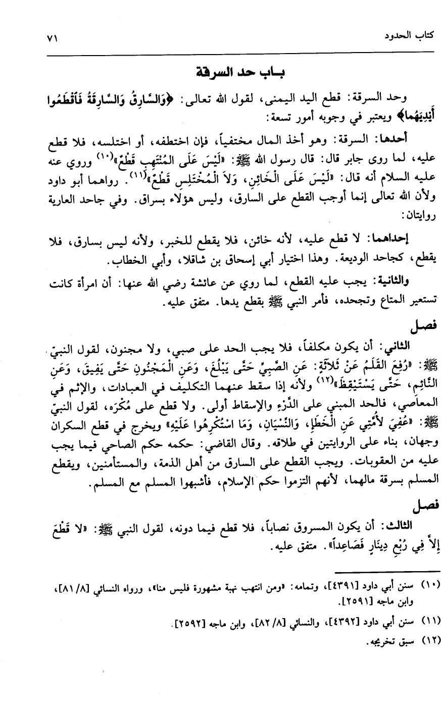 الثاني: أن يكون مكلفاً، فلا يجب الحد على صبي، ولا مجنون؛ لقول النبي - صَلَّى اللَّهُ عَلَيْهِ وَسَلَّمَ -: «رفع القلم عن ثلاثة: عن الصبي حتى يبلغ، وعن المجنون حتى يفيق، وعن النائم حتى يستيقظ» ولأنه إذا سقط عنهما التكليف في العبادات، والإثم في المعاصي، فالحد المبني على الدرء والإسقاط أولى. ولا قطع على مكره؛ لقول النبي - صَلَّى اللَّهُ عَلَيْهِ وَسَلَّمَ -: «عفي لأمتي عن الخطأ والنسيان وما استكرهوا عليه» ويخرج في قطع السكران وجهان، بناء على الروايتين في طلاقه. وقال القاضي: حكمه حكم الصاحي فيما يجب عليه من العقوبات. ويجب القطع على السارق من أهل الذمة، والمستأمنين، ويقطع المسلم بسرقة مالهما؛ لأنهم التزموا حكم الإسلام، فأشبهوا المسلم مع المسلم.