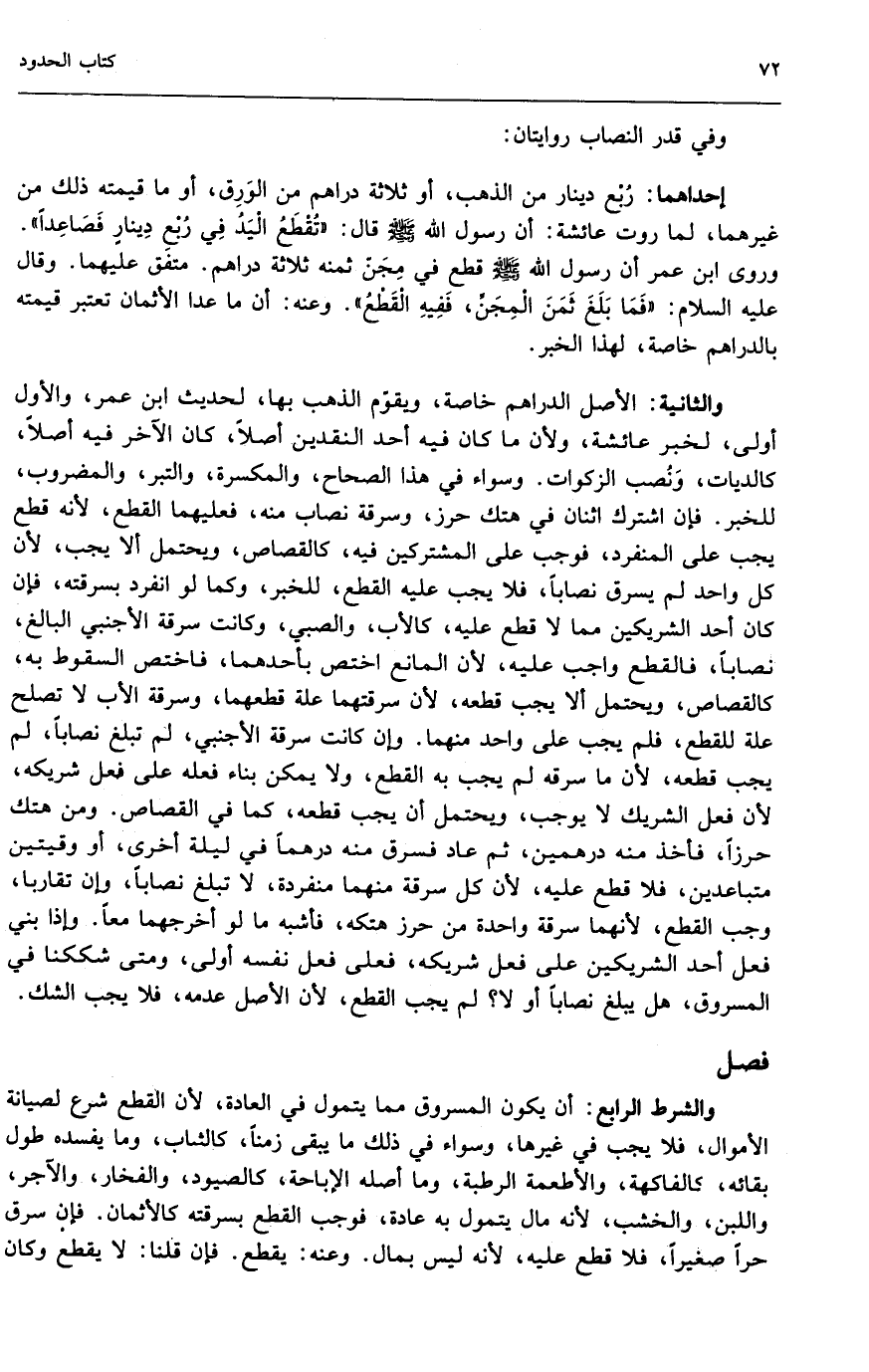 والثانية: الأصل الدراهم خاصة، ويقوم الذهب بها؛ لحديث ابن عمر، والأول أولى؛ لخبر عائشة، ولأن ما كان فيه أحد النقدين أصلاً، كان الآخر فيه أصلاً، كالديات، ونصب الزكوات. وسواء في هذا الصحاح، والمكسرة، والتبر، والمضروب، للخبر. فإن اشترك اثنان في هتك حرز، وسرقة نصاب منه، فعليهما القطع؛ لأنه قطع يجب على المنفرد، فوجب على المشتركين فيه، كالقصاص، ويحتمل ألا يجب؛ لأن كل واحد لم يسرق نصاباً، فلا يجب عليه القطع، للخبر، وكما لو انفرد بسرقته، فإن كان أحد الشريكين مما لا قطع عليه، كالأب والصبي، وكانت سرقة الأجنبي البالغ، نصاباً، فالقطع واجب عليه؛ لأن المانع اختص بأحدهما، فاختص السقوط به، كالقصاص، ويحتمل ألا يجب قطعه؛ لأن سرقتهما علة قطعهما، وسرقة الأب لا تصلح علة للقطع، فلم يجب على واحد منهما. وإن كانت سرقة الأجنبي، لم تبلغ نصاباً، لم يجب قطعه؛ لأن ما سرقه لم يجب به القطع، ولا يمكن بناء فعله على فعل شريكه؛ لأن فعل الشريك لا يوجب، ويحتمل أن يجب قطعه، كما في القصاص. ومن هتك حرزاً، فأخذ منه درهمين ثم عاد فسرق منه درهماً في ليلة أخرى، أو وقتين متباعدين، فلا قطع عليه؛ لأن كل سرقة منهما منفردة، لا تبلغ نصاباً، وإن تقاربا، وجب القطع؛ لأنهما سرقة واحدة من حرز هتكه، فأشبه ما لو أخرجهما معاً. وإذا بني فعل أحد الشريكين على فعل شريكه، فعلى فعل نفسه أولى، ومتى شككنا في المسروق، هل يبلغ نصاباً أو لا؟ لم يجب القطع؛ لأن الأصل عدمه، فلا يجب الشك.