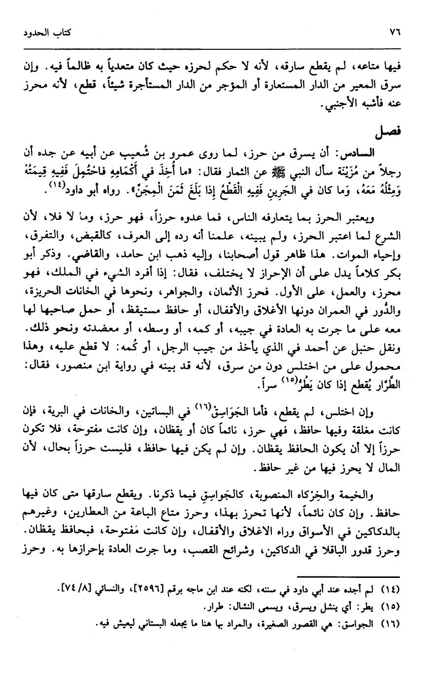 السادس: أن يسرق من حرز؛ لما روى عمرو بن شعيب عن أبيه عن جده «أن رجلاً من مزينة سأل النبي - صَلَّى اللَّهُ عَلَيْهِ وَسَلَّمَ - عن الثمار فقال: ما أخذ في أكمامه فاحتمل ففيه قيمته ومثله معه، وما كان في الجرين ففيه القطع إذا بلغ ثمن المجن» رواه أبو داود.
