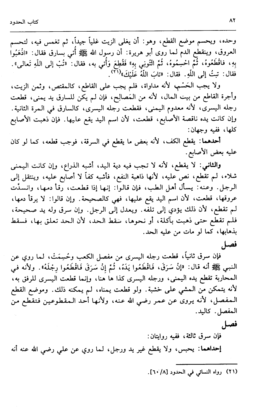 وحده، ويحسم موضع القطع، وهو: أن يغلى الزيت غلياً جيداً، ثم تغمس فيه، لتحسم العروق، وينقطع الدم؛ لما روى أبو هريرة: «أن رسول الله - صَلَّى اللَّهُ عَلَيْهِ وَسَلَّمَ - أتي بسارق فقال: اذهبوا به، فاقطعوه، ثم احسموه، ثم ائتوني به فقطع وأتي به، فقال: تب إلى الله تعالى فقال: تبت إلى الله. فقال: تاب الله عليك» .