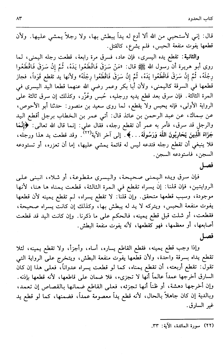 والثانية: تقطع يده اليسرى، فإن عاد، فسرق مرة رابعة، قطعت رجله اليمنى؛ لما روى أبو هريرة أن رسول الله - صَلَّى اللَّهُ عَلَيْهِ وَسَلَّمَ - قال: «من سرق فاقطعوا يده، ثم إن سرق فاقطعوا رجله، ثم إن سرق فاقطعوا يده، ثم إن سرق فاقطعوا رجله» ؛ ولأنها يد تقطع قوداً، فجاز قطعها في السرقة كاليمنى، ولأن أبا بكر وعمر - رَضِيَ اللَّهُ عَنْهُمَا - قطعا اليد اليسرى في المرة الثالثة. فإن سرق بعد قطع يديه ورجليه، حبس وعزر، وكذلك إن سرق ثالثة على الرواية الأولى، فإنه يحبس ولا يقطع؛ لما روى سعيد بن منصور: حدثنا أبو الأحوص، عن سماك، عن عبد الرحمن بن عائذ قال: أتي عمر بن الخطاب برجل أقطع اليد والرجل قد سرق، فأمر به عمر أن تقطع رجله، فقال علي: إنما قال الله تعالى: {إِنَّمَا جَزَاءُ الَّذِينَ يُحَارِبُونَ اللَّهَ وَرَسُولَهُ} [المائدة: 33] إلى آخر الآية. وقد قطعت يد هذا ورجله، فلا ينبغي أن تقطع رجله فتدعه ليس له قائمة يمشي عليها، إما أن تعزره، أو تستودعه السجن، فاستودعه السجن.