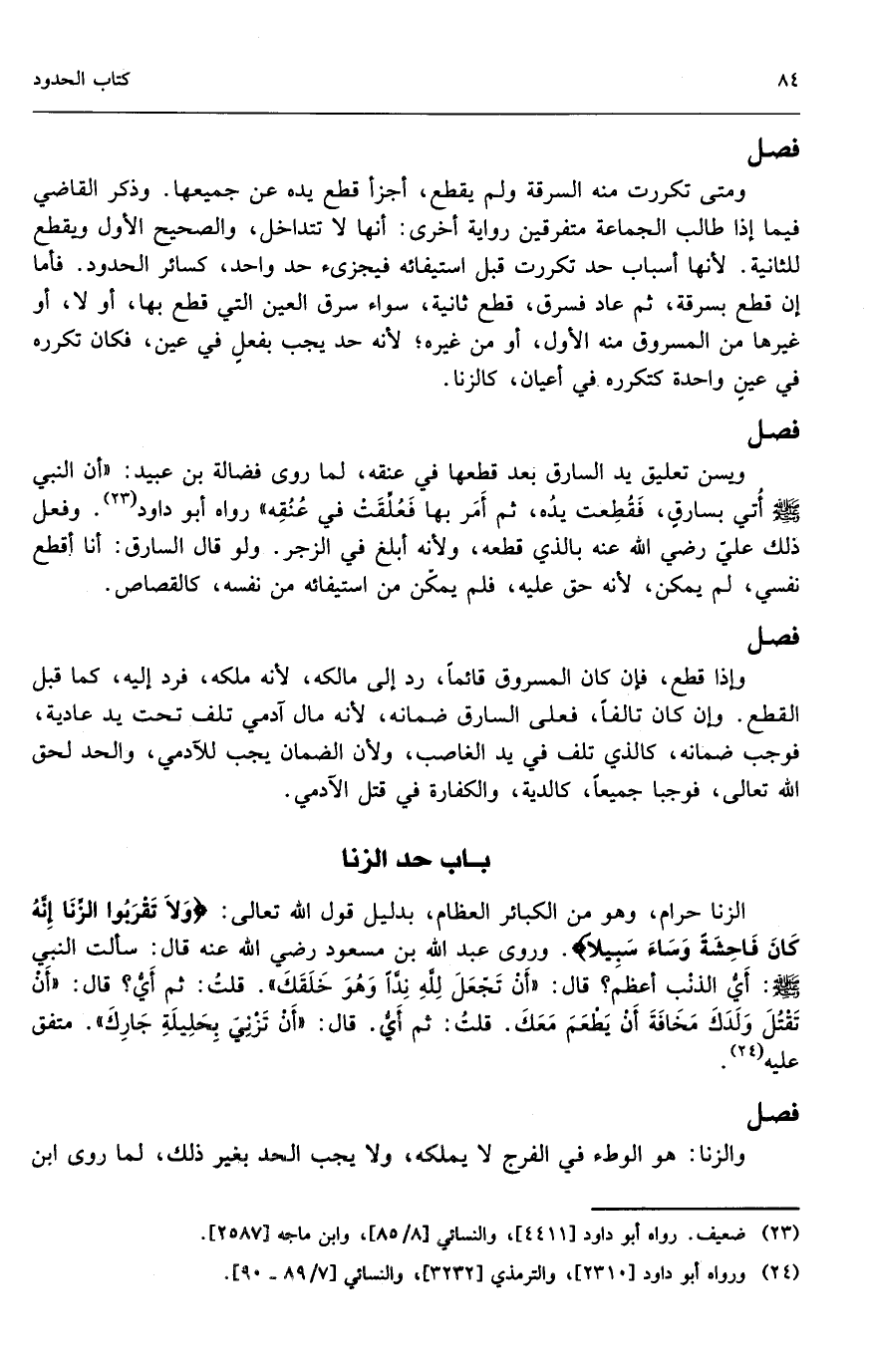 ويسن تعليق يد السارق بعد قطعها في عنقه؛ لما روى فضالة بن عبيد: «أن النبي - صَلَّى اللَّهُ عَلَيْهِ وَسَلَّمَ - أتي بسارق فقطعت يده، ثم أمر بها فعلقت في عنقه» رواه أبو داود. وفعل ذلك علي - رَضِيَ اللَّهُ عَنْهُ - بالذي قطعه؛ ولأنه أبلغ في الزجر. ولو قال السارق: أنا أقطع نفسي، لم يُمَكَّن؛ لأنه حق عليه، فلم يُمَكَّن من استيفائه من نفسه، كالقصاص.