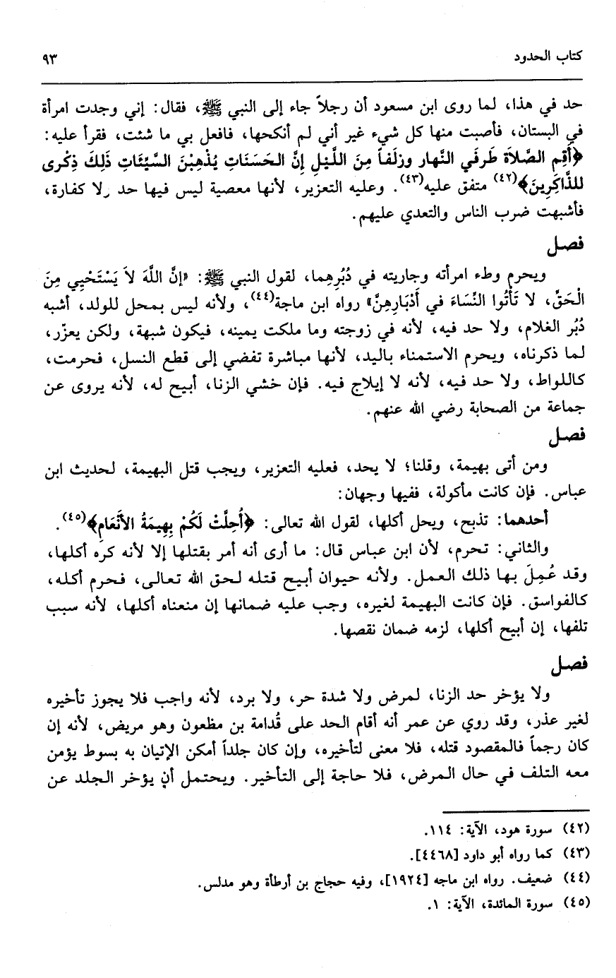 ويحرم وطء امرأته وجاريته في دبرهما؛ لقول النبي - صَلَّى اللَّهُ عَلَيْهِ وَسَلَّمَ -: «إن الله لا يستحيي من الحق، لا تأتوا النساء في أدبارهن» رواه ابن ماجه، ولأنه ليس بمحل للولد أشبه دبر الغلام، ولا حد فيه؛ لأنه في زوجته وما ملكت يمينه، فيكون شبهة، ولكن يعزر، لما ذكرناه، ويحرم الاستمناء باليد؛ لأنها مباشرة تفضي إلى قطع النسل، فحرمت كاللواط، ولا حد فيه؛ لأنه لا إيلاج فيه، فإن خشي الزنا، أبيح له؛ لأنه يروى عن جماعة من الصحابة - رَضِيَ اللَّهُ عَنْهُمْ -.
