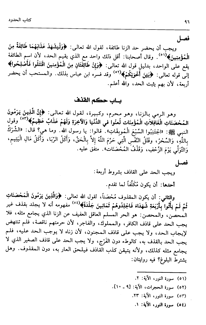 باب حكم القذف وهو الرمي بالزنا، وهو محرم وكبيرة؛ لقول الله تعالى: {إِنَّ الَّذِينَ يَرْمُونَ الْمُحْصَنَاتِ الْغَافِلاتِ الْمُؤْمِنَاتِ لُعِنُوا فِي الدُّنْيَا وَالآخِرَةِ وَلَهُمْ عَذَابٌ عَظِيمٌ} [النور: 23] وقول النبي - صَلَّى اللَّهُ عَلَيْهِ وَسَلَّمَ -: «اجتنبوا السبع الموبقات قالوا: يا رسول الله، ما هي؟ قال: الشرك بالله، والسحر، وقتل النفس التي حرم الله إلا بالحق، وأكل الربا، وأكل مال اليتيم، والتولي يوم الزحف، وقذف المحصنات» متفق عليه.