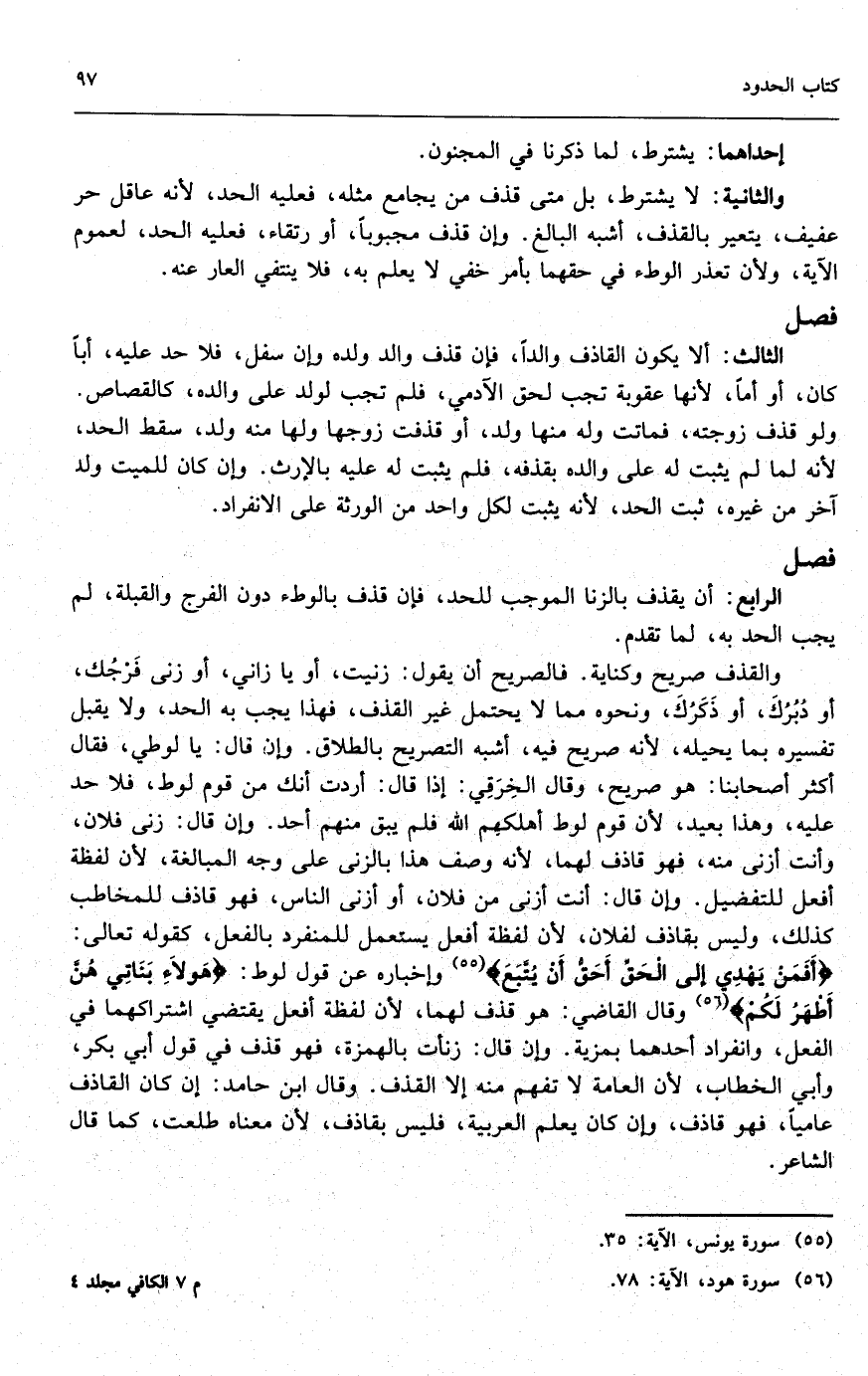 والقذف صريح وكناية؛ فالصريح أن يقول: زنيت، أو يا زاني، أو زنى فرجك، أو دبرك أو ذكرك، ونحوه مما لا يحتمل غير القذف، فهذا يجب به الحد، ولا يقبل تفسيره بما يحيله؛ لأنه صريح فيه، أشبه التصريح بالطلاق. وإن قال: يا لوطي، فقال أكثر أصحابنا: هو صريح، وقال الخرقي: إذا قال: أردت أنك من قوم لوط، فلا حد عليه، وهذا بعيد؛ لأن قوم لوط أهلكهم الله فلم يبق منهم أحد. وإن قال: زنى فلان، وأنت أزنى منه، فهو قاذف لهما؛ لأنه وصف هذا بالزنى على وجه المبالغة؛ لأن لفظة أفعل للتفضيل. وإن قال: أنت أزنى من فلان، أو أزنى الناس، فهو قاذف للمخاطب كذلك، وليس بقاذف لفلان؛ لأن لفظة أفعل يستعمل للمنفرد بالفعل، كقوله تعالى: {أَفَمَنْ يَهْدِي إِلَى الْحَقِّ أَحَقُّ أَنْ يُتَّبَعَ} [يونس: 35] وإخباره عن قوم لوط: {هَؤُلاءِ بَنَاتِي هُنَّ أَطْهَرُ لَكُمْ} [هود: 78] وقال القاضي: هو قذف لهما؛ لأن لفظة أفعل يقتضي اشتراكهما في الفعل، وانفراد أحدهما بمزية. وإن قال: زنأت بالهمزة، فهو قذف في قول أبي بكر وأبي الخطاب؛ لأن العامة لا تفهم منه إلا القذف. وقال ابن حامد: إن كان القاذف عامياً فهو قاذف، وإن كان يعلم العربية، فليس بقاذف؛ لأن معناه طلعت، كما قال الشاعر: