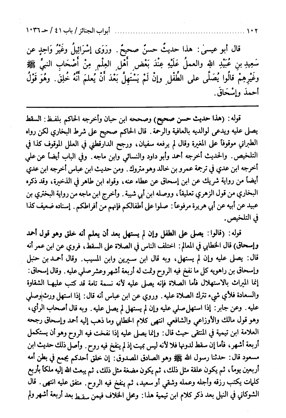 وبِهِ قَالَ أَصْحَابُ الرَّأْيِ وَهُوَ قَوْلُ مَالِكٍ وَالْأَوْزَاعِيِّ وَالشَّافِعِيِّ انْتَهَى كَلَامُ الْخَطَّابِيِّ وَمَا ذَهَبَ إِلَيْهِ أحمد وإسحاق رجحه العلامة بن تَيْمِيَّةَ فِي الْمُنْتَقَى حَيْثُ قَالَ وَإِنَّمَا يُصَلَّى عَلَيْهِ إِذَا نُفِخَتْ فِيهِ الرُّوحُ وَهُوَ أَنْ يَسْتَكْمِلَ أَرْبَعَةَ أَشْهُرٍ فَأَمَّا إِنْ سَقَطَ لِدُونِهَا فَلَا لِأَنَّهُ لَيْسَ بِمَيِّتٍ إِذْ لَمْ يُنْفَخْ فيه روح