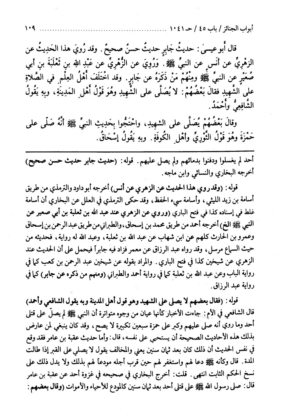 أُحُدٍ لَمْ يُغَسَّلُوا وَدُفِنُوا بِدِمَائِهِمْ وَلَمْ يُصَلَّ عَلَيْهِمْ