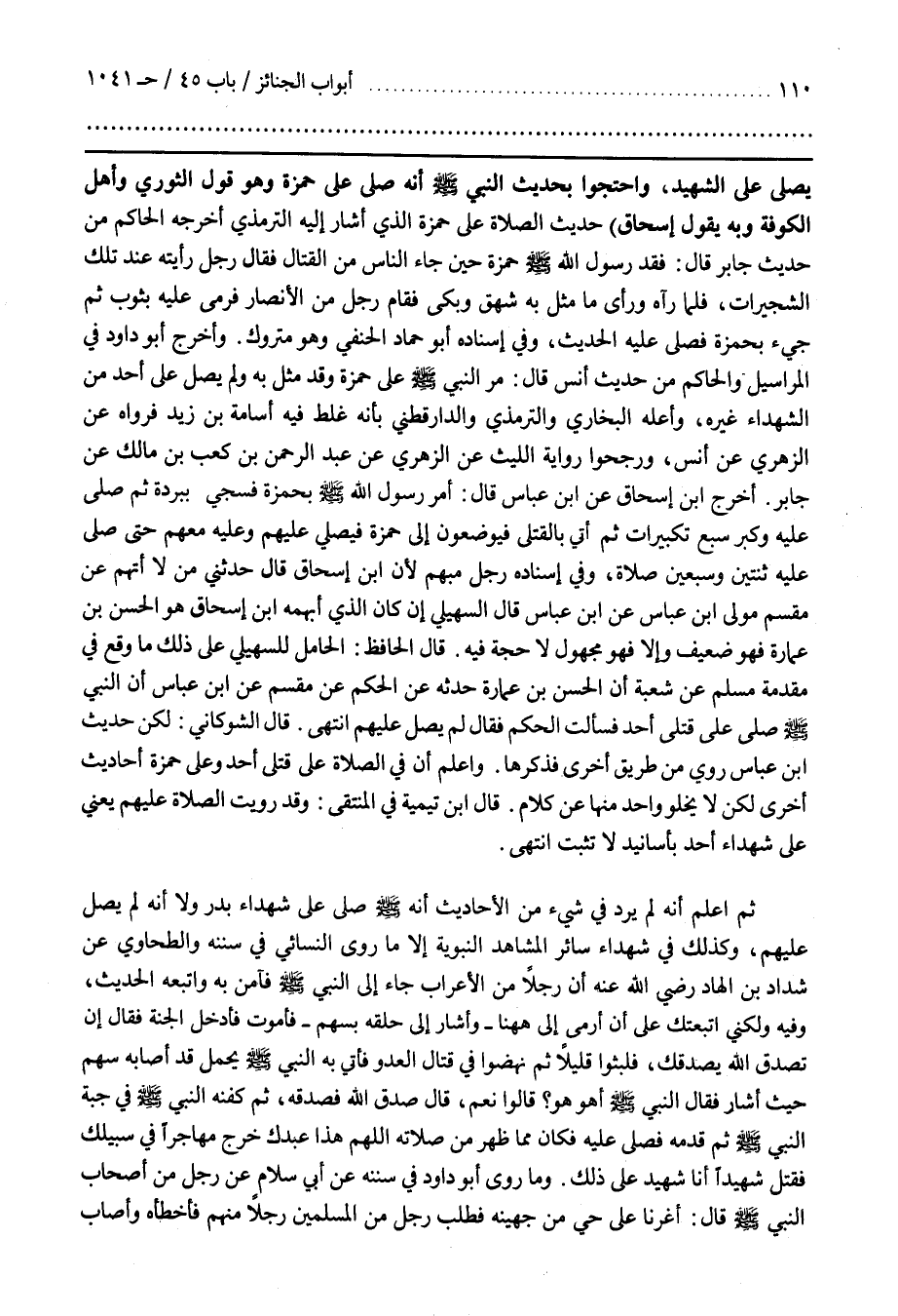 يُصَلَّى عَلَى الشَّهِيدِ وَاحْتَجُّوا بِحَدِيثِ النَّبِيِّ صَلَّى اللَّه عَلَيْهِ وَسَلَّمَ أَنَّهُ صَلَّى عَلَى حَمْزَةَ وَهُوَ قَوْلُ الثَّوْرِيِّ وَأَهْلِ الْكُوفَةِ وَبِهِ يَقُولُ إِسْحَاقُ) حَدِيثُ الصَّلَاةِ عَلَى حَمْزَةَ الَّذِي أَشَارَ إِلَيْهِ التِّرْمِذِيُّ أَخْرَجَهُ الْحَاكِمُ مِنْ حَدِيثِ جَابِرٍ قَالَ فَقَدَ رَسُولُ اللَّهِ صَلَّى اللَّهُ عَلَيْهِ وَسَلَّمَ حَمْزَةَ حِينَ جَاءَ النَّاسُ مِنَ الْقِتَالِ فَقَالَ رَجُلٌ رَأَيْتُهُ عِنْدَ تِلْكَ الشُّجَيْرَاتِ فَلَمَّا رَآهُ وَرَأَى مَا مُثِّلَ بِهِ شَهِقَ وَبَكَى فَقَامَ رَجُلٌ مِنَ الْأَنْصَارِ فَرَمَى عَلَيْهِ بِثَوْبٍ ثُمَّ جِيءَ بِحَمْزَةَ فَصَلَّى عَلَيْهِ الْحَدِيثَ وفِي إِسْنَادِهِ أَبُو حَمَّادٍ الْحَنَفِيُّ وَهُوَ مَتْرُوكٌ