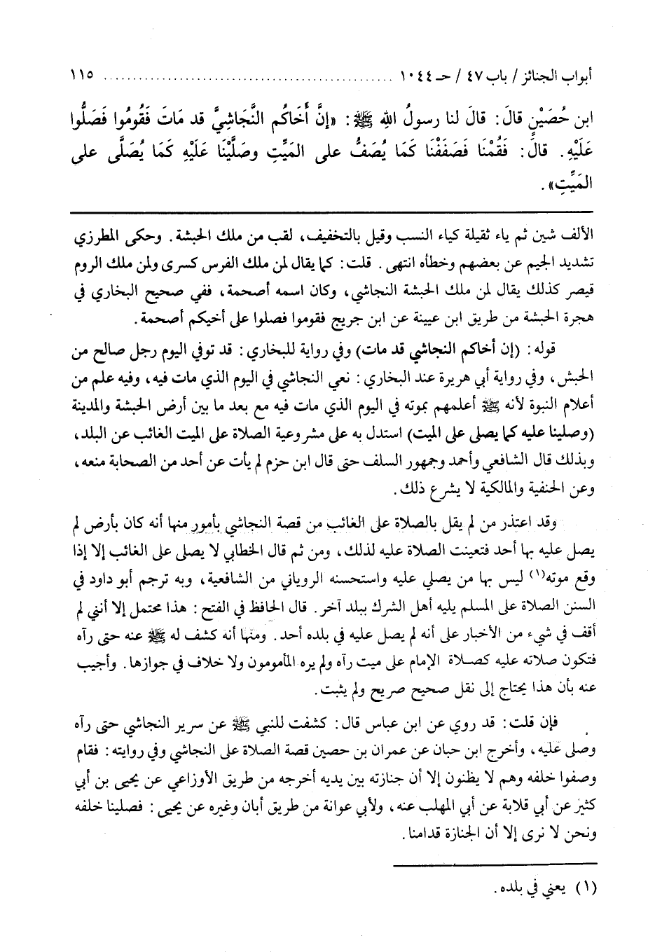 وقَدْ اعْتَذَرَ مَنْ لَمْ يَقُلْ بِالصَّلَاةِ عَلَى الْغَائِبِ مِنْ قِصَّةِ النَّجَاشِيِّ بِأُمُورٍ مِنْهَا أَنَّهُ كَانَ بِأَرْضٍ لَمْ يُصَلِّ عَلَيْهِ بِهَا أَحَدٌ فَتَعَيَّنَتِ الصَّلَاةُ عَلَيْهِ لِذَلِكَ وَمِنْ ثَمَّ قَالَ الْخَطَّابِيُّ لَا يُصَلَّى عَلَى الْغَائِبِ إِلَّا إِذَا وَقَعَ مَوْتُهُ لَيْسَ بِهَا مَنْ يُصَلِّي عَلَيْهِ وَاسْتَحْسَنَهُ الرُّويَانِيُّ مِنَ الشَّافِعِيَّةِ وَبِهِ تَرْجَمَ أَبُو دَاوُدَ فِي السُّنَنِ الصَّلَاةُ عَلَى الْمُسْلِمِ يَلِيهِ أَهْلُ الشِّرْكِ بِبَلَدٍ آخَرَ قَالَ الْحَافِظُ فِي الْفَتْحِ هَذَا مُحْتَمِلٌ إِلَّا أَنَّنِي لَمْ أَقِفْ فِي شَيْءٍ مِنَ الْأَخْبَارِ عَلَى أَنَّهُ لَمْ يُصَلِّ عَلَيْهِ فِي بَلَدِهِ أَحَدٌ