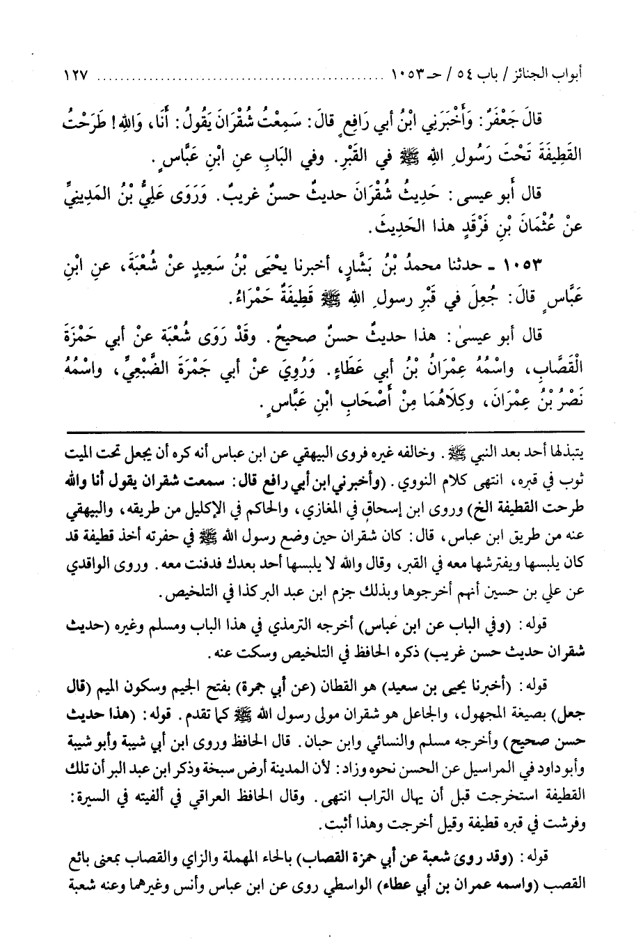 والبيهقي عنه من طريق بن عَبَّاسٍ قَالَ كَانَ شُقْرَانُ حِينَ وُضِعَ رَسُولُ اللَّهِ صَلَّى اللَّهُ عَلَيْهِ وَسَلَّمَ فِي حُفْرَتِهِ أَخَذَ قَطِيفَةً قَدْ كَانَ يَلْبَسُهَا وَيَفْتَرِشُهَا فَدَفَنَهَا مَعَهُ فِي الْقَبْرِ وَقَالَ وَاللَّهِ لَا يَلْبَسُهَا أَحَدٌ بَعْدَكَ فَدُفِنَتْ مَعَهُ