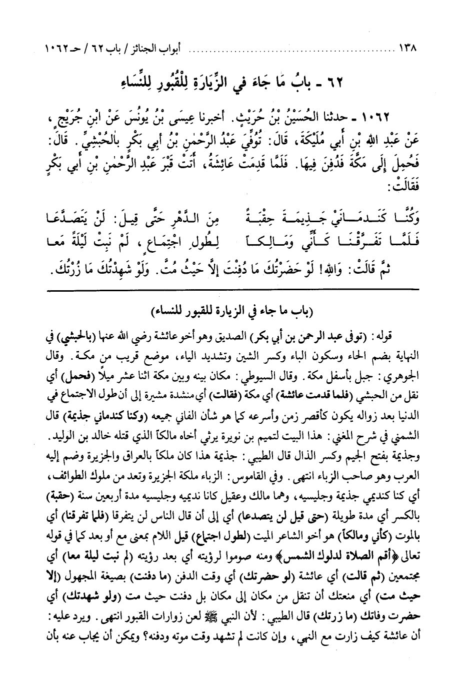 وَفِي الْقَامُوسِ الزَّبَّاءُ مَلِكَةُ الْجَزِيرَةِ وَتُعَدُّ مِنْ مُلُوكِ الطَّوَائِفِ أَيْ كُنَّا كَنَدِيمَيْ جَذِيمَةَ وَجَلِيسَيْهِ وَهُمَا مَالِكٌ وَعَقِيلٌ كَانَا نَدِيمَيْهِ وَجَلِيسَيْهِ مُدَّةَ أَرْبَعِينَ سَنَةً (حِقْبَةً) بِالْكَسْرِ أَيْ مُدَّةً طَوِيلَةً (حَتَّى قِيلَ لَنْ يَتَصَدَّعَا) أَيْ إِلَى أَنْ قَالَ النَّاسُ لَنْ يَتَفَرَّقَا (فَلَمَّا تَفَرَّقْنَا) أَيْ بِالْمَوْتِ (كَأَنِّي وَمَالِكًا) هُوَ أَخُو الشَّاعِرِ الْمَيِّتِ (لِطُولِ اجْتِمَاعٍ) قِيلَ اللَّامُ بِمَعْنَى مَعَ أَوْ بَعْدَ كَمَا فِي قَوْلِهِ تعالى أقم الصلاة لدلوك الشمس وَمِنْهُ صُومُوا لِرُؤْيَتِهِ أَيْ بَعْدَ رُؤْيَتِهِ (لَمْ نَبِتْ لَيْلَةً مَعًا) أَيْ مُجْتَمَعِينَ (ثُمَّ قَالَتْ) أَيْ عَائِشَةُ (لَوْ حَضَرْتُكَ) أَيْ وَقْتَ الدَّفْنِ (مَا دُفِنْتَ) بِصِيغَةِ الْمَجْهُولِ (إِلَّا حَيْثُ مُتَّ) أَيْ مَنَعْتُكَ أَنْ تُنْقَلَ مِنْ مَكَانٍ إِلَى مَكَانٍ بَلْ دُفِنْتَ حَيْثُ مُتَّ (وَلَوْ شَهِدْتُكَ) أَيْ حَضَرْتُ وَفَاتَكَ (مَا زُرْتُكَ) قَالَ الطِّيبِيُّ لِأَنَّ النَّبِيَّ صَلَّى اللَّهُ عَلَيْهِ وَسَلَّمَ لَعَنَ زَوَّارَاتِ الْقُبُورِ انْتَهَى