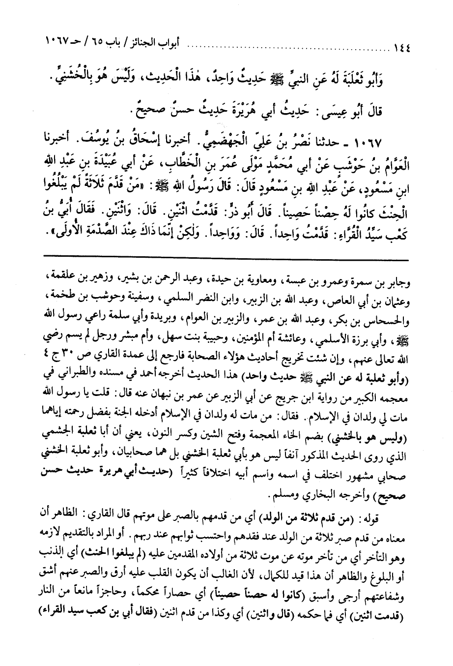 فَقَالَ مَنْ مات له ولدان في الإسلام أدخله الْجَنَّةَ بِفَضْلِ رَحْمَتِهِ إِيَّاهُمَا (وَلَيْسَ هُوَ بِالْخُشَنِيِّ) بِضَمِّ الْخَاءِ الْمُعْجَمَةِ وَفَتْحِ الشِّينِ وَكَسْرِ النُّونِ يَعْنِي أَنَّ أَبَا ثَعْلَبَةَ الْجُشَمِيَّ الَّذِي رَوَى الْحَدِيثَ الْمَذْكُورَ آنِفًا لَيْسَ هُوَ بِأَبِي ثَعْلَبَةَ الْخُشَنِيِّ بَلْ هُمَا صَحَابِيَّانِ وَأَبُو ثَعْلَبَةَ الْخُشَنِيُّ صَحَابِيٌّ مَشْهُورٌ اخْتُلِفَ فِي اسْمِهِ وَاسْمِ أَبِيهِ اخْتِلَافًا كَثِيرًا (وَحَدِيثُ أَبِي هُرَيْرَةَ حَدِيثٌ حَسَنٌ صَحِيحٌ) وَأَخْرَجَهُ الْبُخَارِيُّ وَمُسْلِمٌ