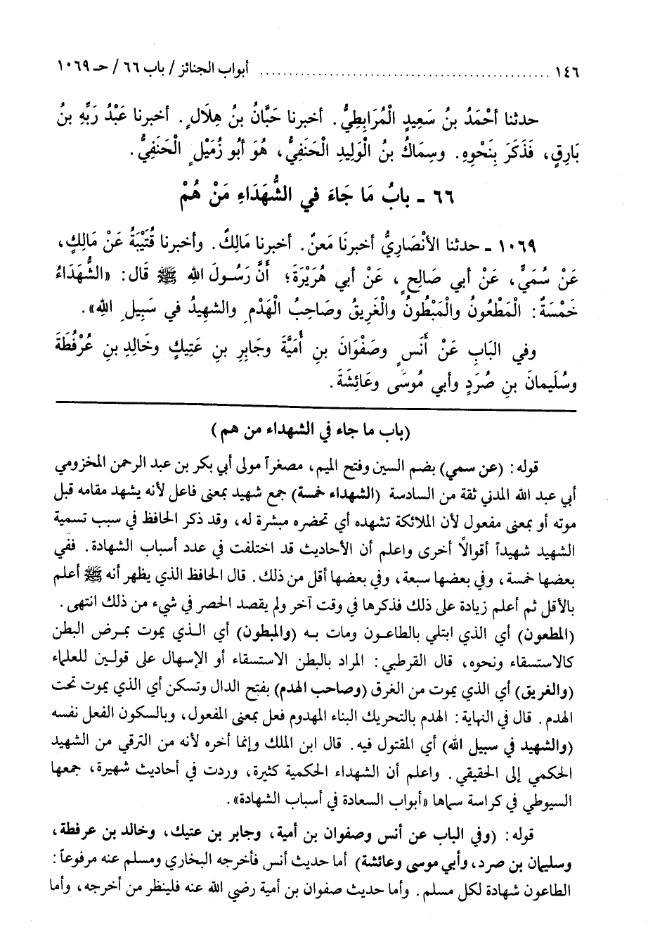 [1063] قَوْلُهُ (عَنْ سُمَيٍّ) بِضَمِّ السِّينِ وَفَتْحِ الْمِيمِ مُصَغَّرًا مَوْلَى أَبِي بَكْرِ بْنِ عَبْدِ الرَّحْمَنِ الْمَخْزُومِيِّ أَبِي عَبْدِ اللَّهِ الْمَدَنِيِّ ثِقَةٌ مِنَ السَّادِسَةِ (الشُّهَدَاءُ خَمْسَةٌ) جَمْعُ شَهِيدٍ بِمَعْنَى فَاعِلٍ لِأَنَّهُ يَشْهَدُ مَقَامَهُ قَبْلَ مَوْتِهِ أَوْ بِمَعْنَى مَفْعُولٍ لِأَنَّ الْمَلَائِكَةَ تَشْهَدُهُ أَيْ تَحْضُرُهُ مُبَشِّرَةً لَهُ وَقَدْ ذَكَرَ الْحَافِظُ فِي سَبَبِ تَسْمِيَةِ الشَّهِيدِ شَهِيدًا أَقْوَالًا أُخْرَى وَاعْلَمْ أَنَّ الْأَحَادِيثَ قَدْ اخْتَلَفَتْ فِي عَدَدِ أَسْبَابِ الشَّهَادَةِ