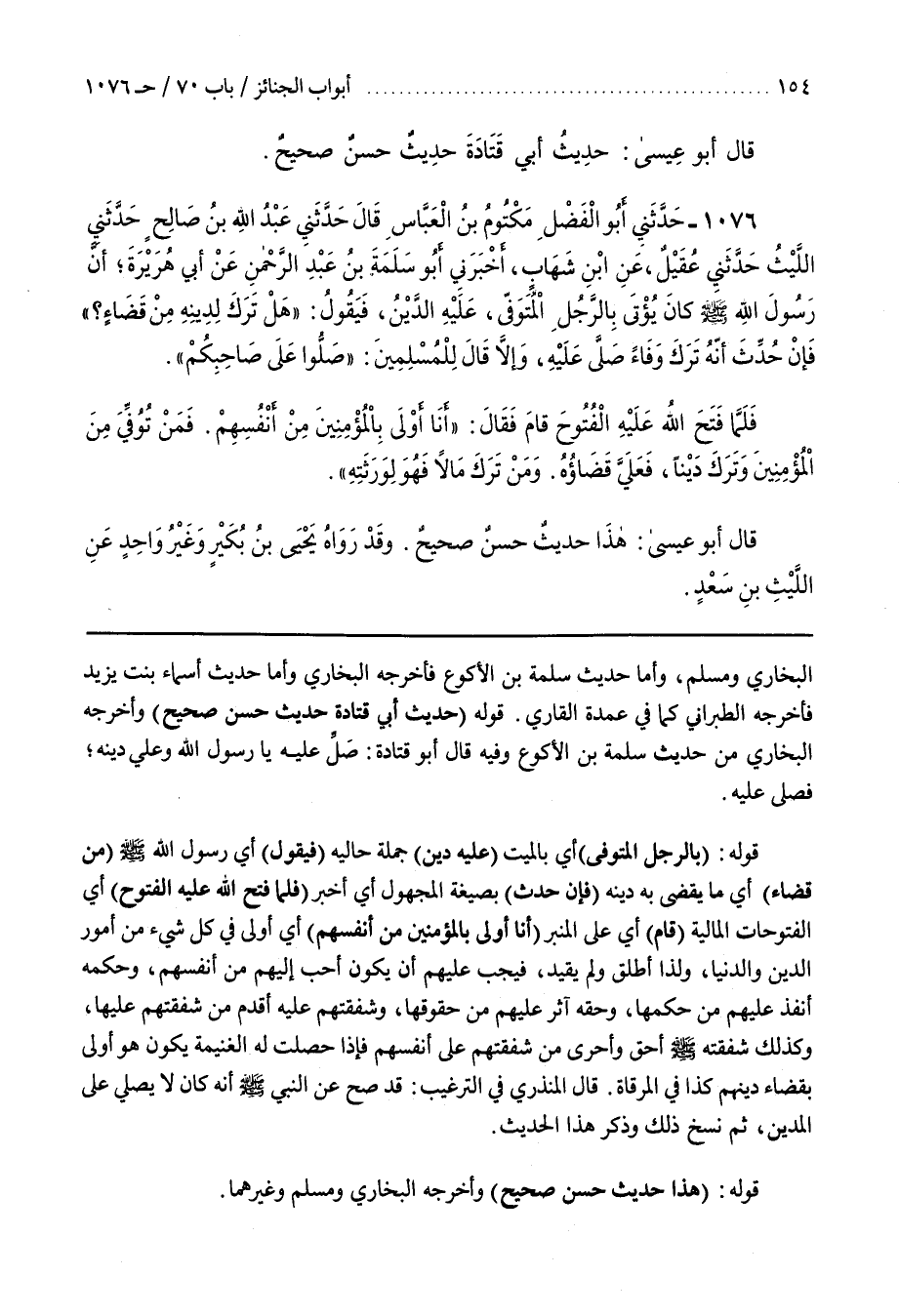 قَوْلُهُ (حَدِيثُ أَبِي قَتَادَةَ حَدِيثٌ حَسَنٌ صَحِيحٌ) وَأَخْرَجَهُ الْبُخَارِيُّ مِنْ حَدِيثِ سَلَمَةَ بْنِ الْأَكْوَعِ وفِيهِ قَالَ أَبُو قَتَادَةَ صَلِّ عَلَيْهِ يَا رَسُولَ اللَّهِ وَعَلَيَّ دَيْنُهُ فَصَلَّى عَلَيْهِ