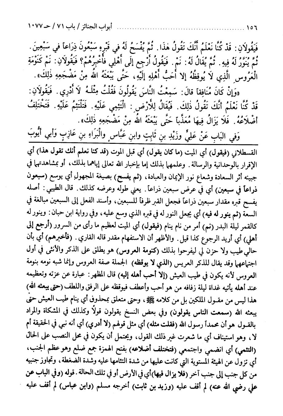 (فَأُخْبِرُهُمْ) أَيْ بِأَنَّ حَالِي طَيِّبٌ وَلَا حُزْنَ لِي لِيَفْرَحُوا بِذَلِكَ (كَنَوْمَةِ الْعَرُوسِ) هُوَ يُطْلَقُ عَلَى الذَّكَرِ وَالْأُنْثَى فِي أَوَّلِ اجْتِمَاعِهِمَا وَقَدْ يُقَالُ لِلذَّكَرِ الْعَرِيسُ (الَّذِي لَا يُوقِظُهُ) الْجُمْلَةُ صِفَةُ الْعَرُوسِ وَإِنَّمَا شَبَّهَ نَوْمَهُ بِنَوْمَةِ الْعَرُوسِ لِأَنَّهُ يَكُونُ فِي طَيِّبِ الْعَيْشِ (إِلَّا أَحَبُّ أَهْلِهِ إِلَيْهِ) قَالَ الْمُظْهَرُ عِبَارَةٌ عَنْ عِزَّتِهِ وَتَعْظِيمِهِ عِنْدَ أَهْلِهِ يَأْتِيهِ غَدَاةَ لَيْلَةِ زِفَافِهِ مَنْ هُوَ أَحَبُّ وَأَعْطَفُ فَيُوقِظُهُ عَلَى الرِّفْقِ وَاللُّطْفِ (حَتَّى يَبْعَثَهُ اللَّهُ) هَذَا لَيْسَ مِنْ مَقُولِ الْمَلَكَيْنِ بَلْ مِنْ كَلَامِهِ صَلَّى اللَّهُ عَلَيْهِ وَسَلَّمَ وَحَتَّى مُتَعَلِّقٌ بِمَحْذُوفٍ أَيْ يَنَامُ طَيِّبَ الْعَيْشِ حَتَّى يَبْعَثَهُ اللَّهُ (سَمِعْتُ النَّاسَ يَقُولُونَ) وفِي بَعْضِ النُّسَخِ يَقُولُونَ قَوْلًا وَكَذَلِكَ فِي الْمِشْكَاةِ وَالْمُرَادُ بِالْقَوْلِ هُوَ أَنَّ مُحَمَّدًا رَسُولُ اللَّهِ (فَقُلْتُ مِثْلَهُ) أَيْ مِثْلَ قَوْلِهِمْ (لَا أَدْرِي) أَيْ أَنَّهُ نَبِيٌّ فِي الْحَقِيقَةِ أم لا وهو استيناف أَيْ مَا شَعَرْتُ غَيْرَ ذَلِكَ الْقَوْلِ وَيَحْتَمِلُ أَنْ يَكُونَ فِي مَحَلِّ النَّصْبِ عَلَى الْحَالِ (التئمي) أي انضمي واجتمحي (فَتَخْتَلِفُ أَضْلَاعُهُ) بِفَتْحِ الْهَمْزَةِ جَمْعُ ضِلَعٍ وَهُوَ عَظْمُ الْجَنْبِ أَيْ تَزُولُ عَنِ الْهَيْئَةِ الْمُسْتَوِيَةِ الَّتِي كَانَتْ عَلَيْهَا مِنْ شِدَّةِ الْتِئَامِهَا عَلَيْهِ وَشِدَّةِ الضَّغْطَةِ وَتُجَاوِزُ جَنْبَيْهِ مِنْ كُلِّ جَنْبٍ إِلَى جَنْبٍ آخَرَ (فَلَا يَزَالُ فِيهَا) أَيْ فِي الْأَرْضِ أَوْ فِي تِلْكَ الْحَالَةِ قَوْلُهُ (وفِي الْبَابِ عَنْ عَلِيٍّ رَضِيَ اللَّهُ عَنْهُ) لَمْ أَقِفْ عَلَيْهِ (وَزَيْدِ بْنِ ثَابِتٍ) أَخْرَجَهُ مسلم (وبن عَبَّاسٍ) لَمْ أَقِفْ عَلَيْهِ
