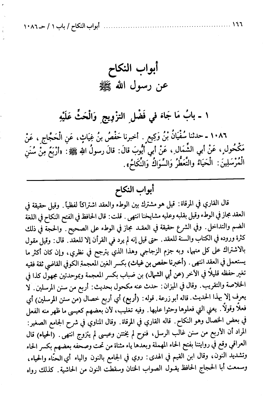 [1080] أَخْبَرَنَا حَفْصُ بْنُ غِيَاثٍ بِكَسْرِ الْغَيْنِ الْمُعْجَمَةِ الْكُوفِيُّ الْقَاضِي ثِقَةٌ فَقِيهٌ تَغَيَّرَ حِفْظُهُ قَلِيلًا فِي الْآخِرِ عَنْ أَبِي الشِّمَالِ بْنِ ضِبَابٍ بِكَسْرِ الْمُعْجَمَةِ وَبِمُوَحَّدَتَيْنِ مَجْهُولٌ كَذَا فِي الْخُلَاصَةِ وَالتَّقْرِيبِ وقَالَ فِي الْمِيزَانِ حَدَّثَ عَنْهُ مَكْحُولٌ بِحَدِيثِ أَرْبَعٌ مِنْ سُنَنِ الْمُرْسَلِينَ لَا يُعْرَفُ إِلَّا بِهَذَا الْحَدِيثِ قَالَهُ أَبُو زُرْعَةَ قَوْلُهُ أَرْبَعٌ أَيْ أَرْبَعُ خِصَالٍ مِنْ سُنَنِ الْمُرْسَلِينَ أَيْ فِعْلًا وَقَوْلًا يَعْنِي الَّتِي فَعَلُوهَا وَحَثُّوا عَلَيْهَا وفِيهِ تَغْلِيبٌ لِأَنَّ بَعْضَهُمْ كَعِيسَى مَا ظَهَرَ مِنْهُ الْفِعْلُ فِي بَعْضِ الْخِصَالِ وَهُوَ النِّكَاحُ قاله القارىء فِي الْمِرْقَاةِ وقَالَ الْمُنَاوِيُّ فِي شَرْحِ الْجَامِعِ الصَّغِيرِ الْمُرَادُ أَنَّ الْأَرْبَعَ مِنْ سُنَنِ غَالِبِ الرُّسُلِ فَنُوحٌ لَمْ يَخْتَتِنْ وَعِيسَى لَمْ يَتَزَوَّجْ انْتَهَى