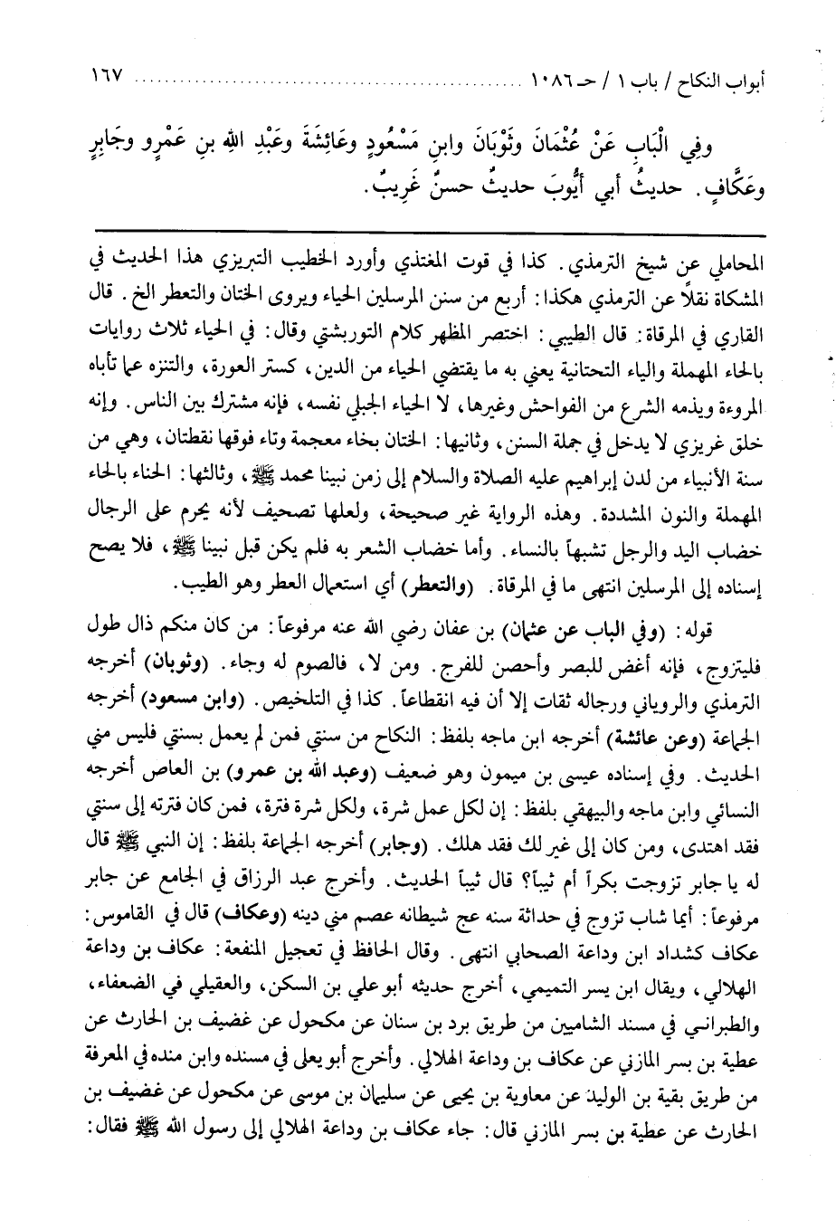 قَوْلُهُ وَفِي الْبَابِ عَنْ عُثْمَانَ بْنِ عَفَّانَ رَضِيَ اللَّهُ عَنْهُ مَرْفُوعًا مَنْ كَانَ مِنْكُمْ ذَا طَوْلٍ فَلْيَتَزَوَّجْ فَإِنَّهُ أَغَضُّ لِلْبَصَرِ وَأَحْصَنُ لِلْفَرْجِ ومَنْ لا فالصوم له وجاء وَثَوْبَانَ أَخْرَجَهُ التِّرْمِذِيُّ وَالرُّويَانِيُّ وَرِجَالُهُ ثِقَاتٌ إِلَّا أن فيه انقطاعا كذا في التلخيص وبن مسعود أخرجه الجماعة وعن عائشة أخرجه بن مَاجَهْ بِلَفْظِ النِّكَاحُ مِنْ سُنَّتِي فَمَنْ لَمْ يَعْمَلْ بِسُنَّتِي فَلَيْسَ مِنِّي الْحَدِيثَ وفِي إِسْنَادِهِ عِيسَى بْنُ مَيْمُونٍ وَهُوَ ضَعِيفٌ وَعَبْدِ اللَّهِ بن عمرو بن العاص أخرجه النسائي وبن مَاجَهْ وَالْبَيْهَقِيُّ بِلَفْظِ إِنَّ لِكُلِّ عَمَلٍ شِرَّةً وَلِكُلِّ شِرَّةٍ فَتْرَةٌ فَمَنْ كَانَ فَتْرَتُهُ إِلَى سُنَّتِي فَقَدْ اهْتَدَى وَمَنْ كَانَ إِلَى غَيْرِ ذَلِكَ فَقَدْ هَلَكَ وَجَابِرٍ أَخْرَجَهُ الْجَمَاعَةُ بِلَفْظِ أَنَّ النَّبِيَّ صَلَّى اللَّهُ عَلَيْهِ وَسَلَّمَ قَالَ لَهُ يَا جَابِرُ تَزَوَّجْتَ بِكْرًا أَمْ ثَيِّبًا قَالَ ثَيِّبًا الْحَدِيثَ وأَخْرَجَ عَبْدُ الرَّزَّاقِ فِي الْجَامِعِ عَنْ جَابِرٍ مَرْفُوعًا أَيُّمَا شَابٍّ تَزَوَّجَ فِي حَدَاثَةِ سِنِّهِ عَجَّ شَيْطَانُهُ عَصَمَ مِنِّي دِينَهُ وَعَكَّافٍ قَالَ فِي الْقَامُوسِ عَكَّافٌ كَشَدَّادٍ بن وَدَاعَةَ الصَّحَابِيُّ انْتَهَى