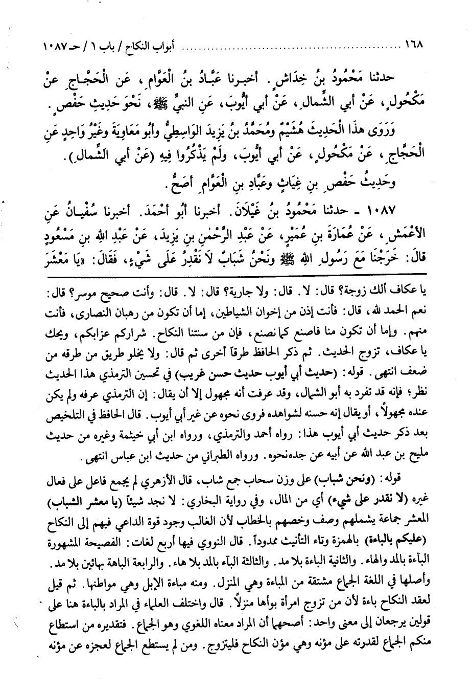 [1081] قَوْلُهُ وَنَحْنُ شَبَابٌ عَلَى وَزْنِ سَحَابٍ جَمْعُ شاب قال الأزهري لَمْ يُجْمَعْ فَاعِلٌ عَلَى فَعَالٍ غَيْرُهُ لَا نَقْدِرُ عَلَى شَيْءٍ أَيْ مِنَ الْمَالِ وفِي رِوَايَةِ الْبُخَارِيِّ لَا نَجِدُ شَيْئًا يَا مَعْشَرَ الشَّبَابِ الْمَعْشَرُ جَمَاعَةٌ يَشْمَلُهُمْ وَصْفٌ وَخَصَّهُمْ بِالْخِطَابِ لِأَنَّ الْغَالِبَ وُجُودُ قُوَّةِ الدَّاعِي فِيهِمْ إِلَى النكاح عليكم بِالْبَاءَةِ بِالْهَمْزَةِ وَتَاءِ التَّأْنِيثِ مَمْدُودًا قَالَ النَّوَوِيُّ فِيهَا أَرْبَعُ لُغَاتٍ الْفَصِيحَةُ الْمَشْهُورَةُ الْبَاءَةُ بِالْمَدِّ وَالْهَاءِ والثَّانِيَةُ الْبَاءَةُ بِلَا مَدٍّ والثَّالِثَةُ الْبَاءُ بِالْمَدِّ بِلَا هَاءٍ والرَّابِعَةُ الْبَاهَةُ بِهَائَيْنِ بِلَا مَدٍّ وأَصْلُهَا فِي اللُّغَةِ الْجِمَاعُ مُشْتَقَّةٌ مِنَ الْمَبَاءَةِ وَهِيَ الْمَنْزِلُ ومِنْهُ مَبَاءَةُ الْإِبِلِ وَهِيَ مَوَاطِنُهَا ثُمَّ قِيلَ لِعَقْدِ النِّكَاحِ بَاءَةٌ لِأَنَّ مَنْ تَزَوَّجَ امْرَأَةً بَوَّأَهَا مَنْزِلًا قَالَ وَاخْتَلَفَ الْعُلَمَاءُ فِي الْمُرَادِ بِالْبَاءَةِ هُنَا عَلَى قَوْلَيْنِ يَرْجِعَانِ إِلَى مَعْنًى وَاحِدٍ أَصَحُّهُمَا أَنَّ الْمُرَادَ معناه اللغوي وهوالجماع فَتَقْدِيرُهُ مَنِ اسْتَطَاعَ مِنْكُمْ الْجِمَاعَ لِقُدْرَتِهِ عَلَى مُؤَنِهِ وَهِيَ مُؤَنُ النِّكَاحِ فَلْيَتَزَوَّجْ ومَنْ لَمْ يَسْتَطِعْ الْجِمَاعَ لِعَجْزِهِ عَنْ مُؤَنِهِ