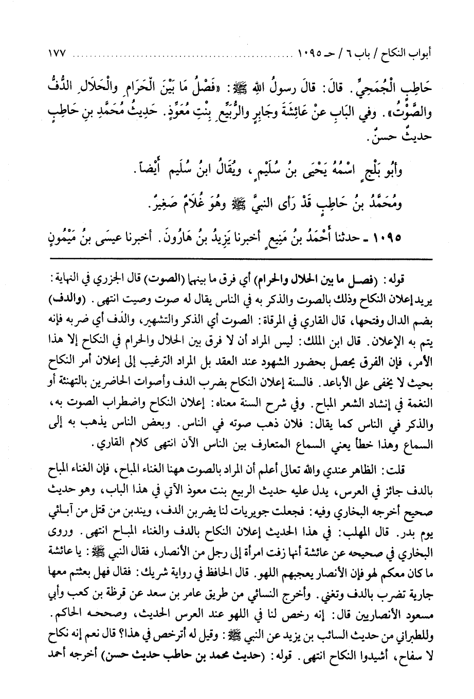 قُلْتُ الظَّاهِرُ عِنْدِي وَاللَّهُ تَعَالَى أَعْلَمُ أَنَّ المراد بالصوت ها هنا الْغِنَاءُ الْمُبَاحُ فَإِنَّ الْغِنَاءَ الْمُبَاحَ بِالدُّفِّ جَائِزٌ فِي الْعُرْسِ يَدُلُّ عَلَيْهِ حَدِيثُ الرُّبَيِّعِ بِنْتِ مُعَوِّذٍ الْآتِي فِي هَذَا الْبَابِ وَهُوَ حَدِيثٌ صَحِيحٌ أَخْرَجَهُ الْبُخَارِيُّ وفِيهِ فَجَعَلَتْ جُوَيْرِيَّاتٌ لَنَا يَضْرِبْنَ بِالدُّفِّ وَيَنْدُبْنَ مَنْ قُتِلَ مِنْ آبَائِي يَوْمَ بَدْرٍ