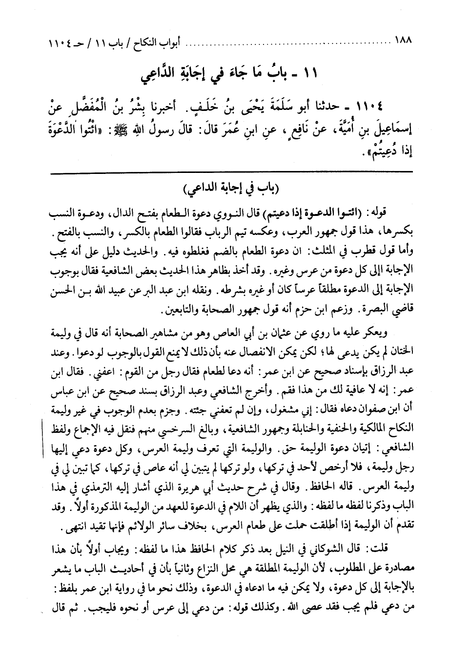 قُلْتُ قَالَ الشَّوْكَانِيُّ فِي النَّيْلِ بَعْدَ ذِكْرِ كَلَامِ الْحَافِظِ هَذَا مَا لَفْظُهُ وَيُجَابُ أَوَّلًا بِأَنَّ هَذَا مُصَادَرَةٌ عَلَى الْمَطْلُوبِ لِأَنَّ الْوَلِيمَةَ الْمُطْلَقَةَ هِيَ مَحَلُّ النِّزَاعِ وَثَانِيًا بِأَنَّ فِي أَحَادِيثِ الْبَابِ مَا يُشْعِرُ بِالْإِجَابَةِ إِلَى كُلِّ دَعْوَةٍ وَلَا يُمْكِنُ فِيهِ مَا ادَّعَاهُ فِي الدَّعْوَةِ وذلك نحو ما في رواية بن عُمَرَ بِلَفْظِ مَنْ دُعِيَ فَلَمْ يُجِبْ فَقَدْ عَصَى اللَّهَ