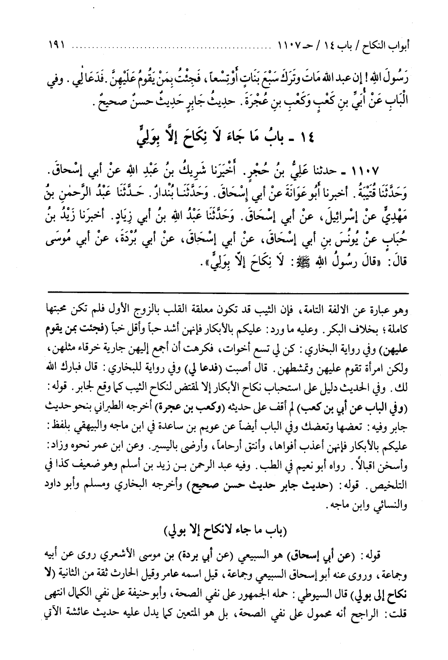 [1101] قَوْلُهُ (عَنْ أَبِي إِسْحَاقَ) هُوَ السَّبِيعِيُّ (عَنْ أَبِي بُرْدَةَ) بْنِ مُوسَى الْأَشْعَرِيِّ رَوَى عَنْ أَبِيهِ وَجَمَاعَةٍ وَرَوَى عَنْهُ أَبُو إِسْحَاقَ السَّبِيعِيُّ وَجَمَاعَةٌ قِيلَ اِسْمُهُ عَامِرٌ وَقِيلَ الْحَارِثُ ثِقَةٌ مِنْ الثَّانِيَةِ (لَا نِكَاحَ إِلَّا بِوَلِيٍّ) قَالَ السُّيُوطِيُّ حَمَلَهُ الْجُمْهُورُ عَلَى نَفْيِ الصِّحَّةِ وَأَبُو حَنِيفَةَ عَلَى نَفْيِ الْكَمَالِ انْتَهَى قُلْتُ الرَّاجِحُ أَنَّهُ مَحْمُولٌ عَلَى نَفْيِ الصِّحَّةِ بَلْ هُوَ الْمُتَعَيِّنُ كَمَا يَدُلُّ عَلَيْهِ حَدِيثُ عَائِشَةَ الآتي