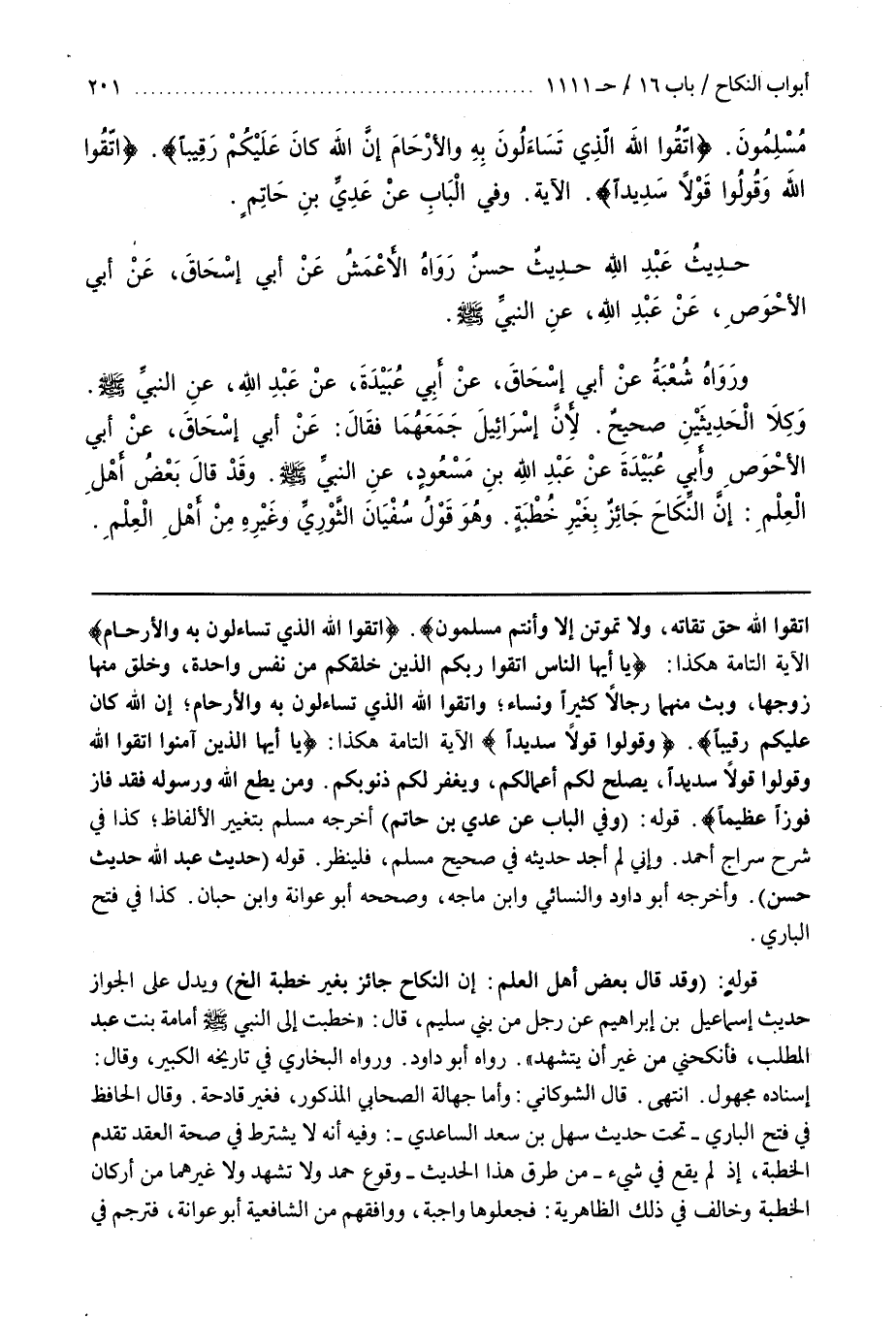 اتقوا الله الذي تساءلون به والأرحام إِلَخْ الْآيَةُ التَّامَّةُ هَكَذَا يَا أَيَّهَا النَّاسُ اتَّقُوا رَبَّكُمْ الَّذِي خَلَقَكُمْ مِنْ نَفْسٍ وَاحِدَةٍ وَخَلَقَ مِنْهَا زَوْجَهَا وَبَثَّ مِنْهُمَا رِجَالًا كَثِيرًا وَنِسَاءً وَاتَّقُوا اللَّهَ الَّذِي تَسَاءَلُونَ بِهِ وَالْأَرْحَامَ إن الله كان عليكم رقيبا وقولوا قولا سديدا الآيةالآية التَّامَّةُ هَكَذَا يَا أَيُّهَا الَّذِينَ آمَنُوا اتَّقُوا اللَّهَ وَقُولُوا قَوْلًا سَدِيدًا يُصْلِحْ لَكُمْ أَعْمَالَكُمْ وَيَغْفِرْ لَكُمْ ذُنُوبَكُمْ وَمَنْ يُطِعْ اللَّهَ وَرَسُولَهُ فقد فاز فوزا عظيما قَوْلُهُ (وَفِي الْبَابِ عَنْ عَدِيِّ بْنِ حَاتِمٍ) أَخْرَجَهُ مُسْلِمٌ بِتَغْيِيرِ الْأَلْفَاظِ كَذَا فِي شَرْحِ سِرَاجِ أَحْمَدَ