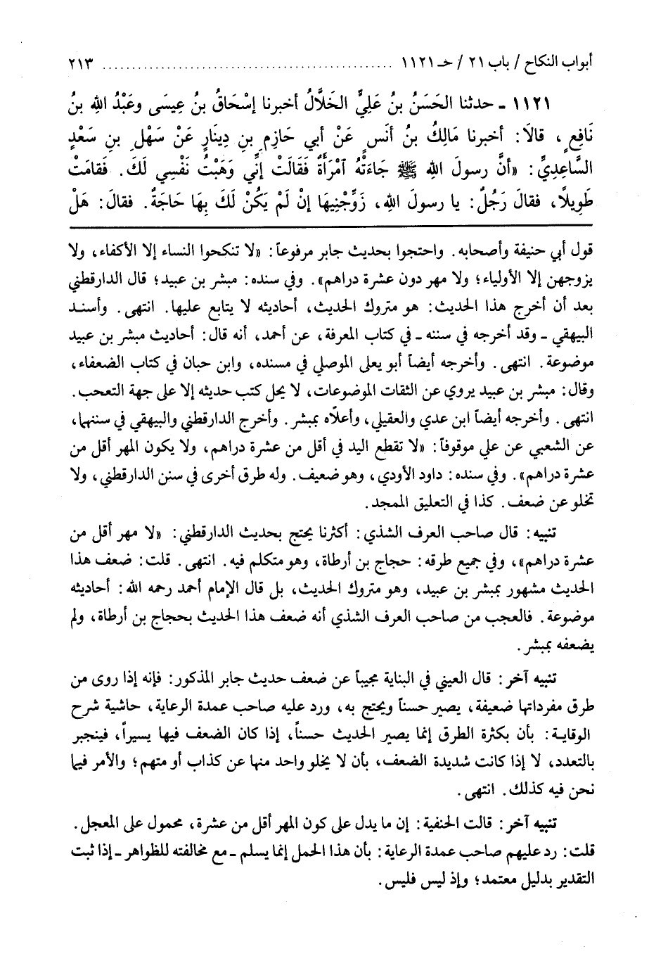 واحْتَجُّوا بِحَدِيثِ جَابِرٍ مَرْفُوعًا لَا تُنْكِحُوا النِّسَاءَ إِلَّا الْأَكْفَاءَ وَلَا يُزَوِّجُهُنَّ إِلَّا الْأَوْلِيَاءُ وَلَا مَهْرَ دُونَ عَشْرَةِ دَرَاهِمَ
