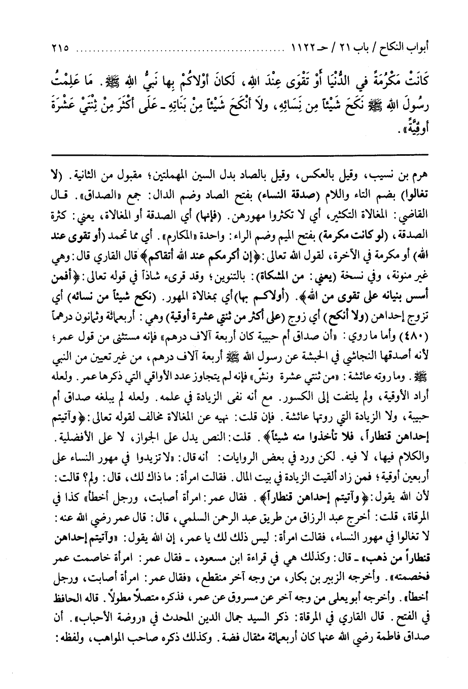فَقَالَتِ امْرَأَةٌ مَا ذَاكَ لَكَ قَالَ وَلِمَ قَالَتْ لأن الله يقول وآتيتم إحداهن قنطارا فَقَالَ عُمَرُ امْرَأَةٌ أَصَابَتْ وَرَجُلٌ أَخْطَأَ كَذَا فِي الْمِرْقَاةِ قُلْتُ أَخْرَجَ عَبْدُ الرَّزَّاقِ مِنْ طَرِيقِ عَبْدِ الرَّحْمَنِ السُّلَمِيِّ قَالَ قَالَ عُمَرُ رَضِيَ اللَّهُ عَنْهُ لَا تُغَالُوا فِي مُهُورِ النِّسَاءِ فَقَالَتِ امْرَأَةٌ لَيْسَ ذَلِكَ لَكَ يَا عُمَرُ إِنَّ اللَّهَ يَقُولُ وَآتَيْتُمْ إِحْدَاهُنَّ قِنْطَارًا مِنْ ذَهَبٍ قَالَ وَكَذَلِكَ هِيَ فِي قِرَاءَةِ بن مَسْعُودٍ فَقَالَ عُمَرُ امْرَأَةٌ خَاصَمَتْ عُمَرَ فَخَصَمَتْهُ