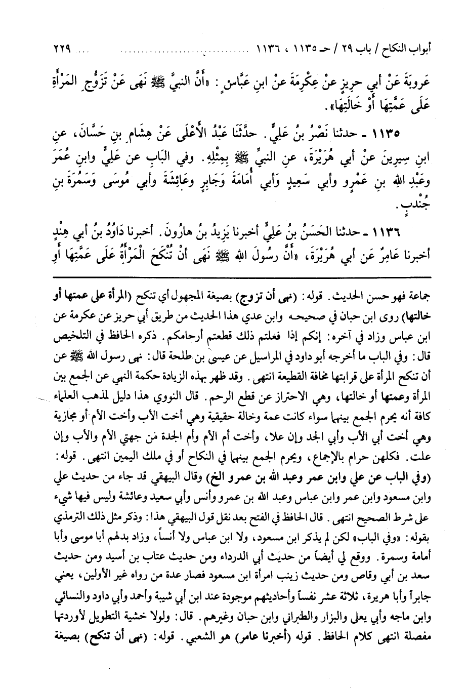 قَالَ النَّوَوِيُّ هَذَا دَلِيلٌ لِمَذْهَبِ الْعُلَمَاءِ كَافَّةً أَنَّهُ يَحْرُمُ الْجَمْعُ بَيْنَهُمَا سَوَاءٌ كَانَتْ عَمَّةً وَخَالَةً حَقِيقِيَّةً وَهِيَ أُخْتُ الْأَبِ وَأُخْتُ الْأُمِّ أَوْ مَجَازِيَّةً وَهِيَ أُخْتُ أَبِي الْأَبِ وَأَبِي الْجَدِّ وَإِنْ عَلَا وَأُخْتُ أُمِّ الْأُمِّ وَأُمِّ الْجَدَّةِ مِنْ جِهَتَيْ الْأُمِّ وَالْأَبِ وَإِنْ عَلَتْ