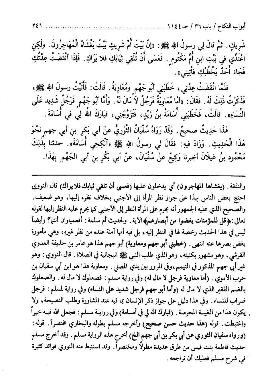 (خَطَبَنِي أَبُو جَهْمٍ وَمُعَاوِيَةُ) أَبُو جَهْمٍ هَذَا هُوَ عَامِرُ بْنُ حُذَيْفَةَ الْعَدَوِيُّ الْقُرَشِيُّ وَهُوَ مَشْهُورٌ بِكُنْيَتِهِ وَهُوَ الَّذِي طَلَبَ النبي صلى الله عليه وسلم انبجانية فِي الصَّلَاةِ