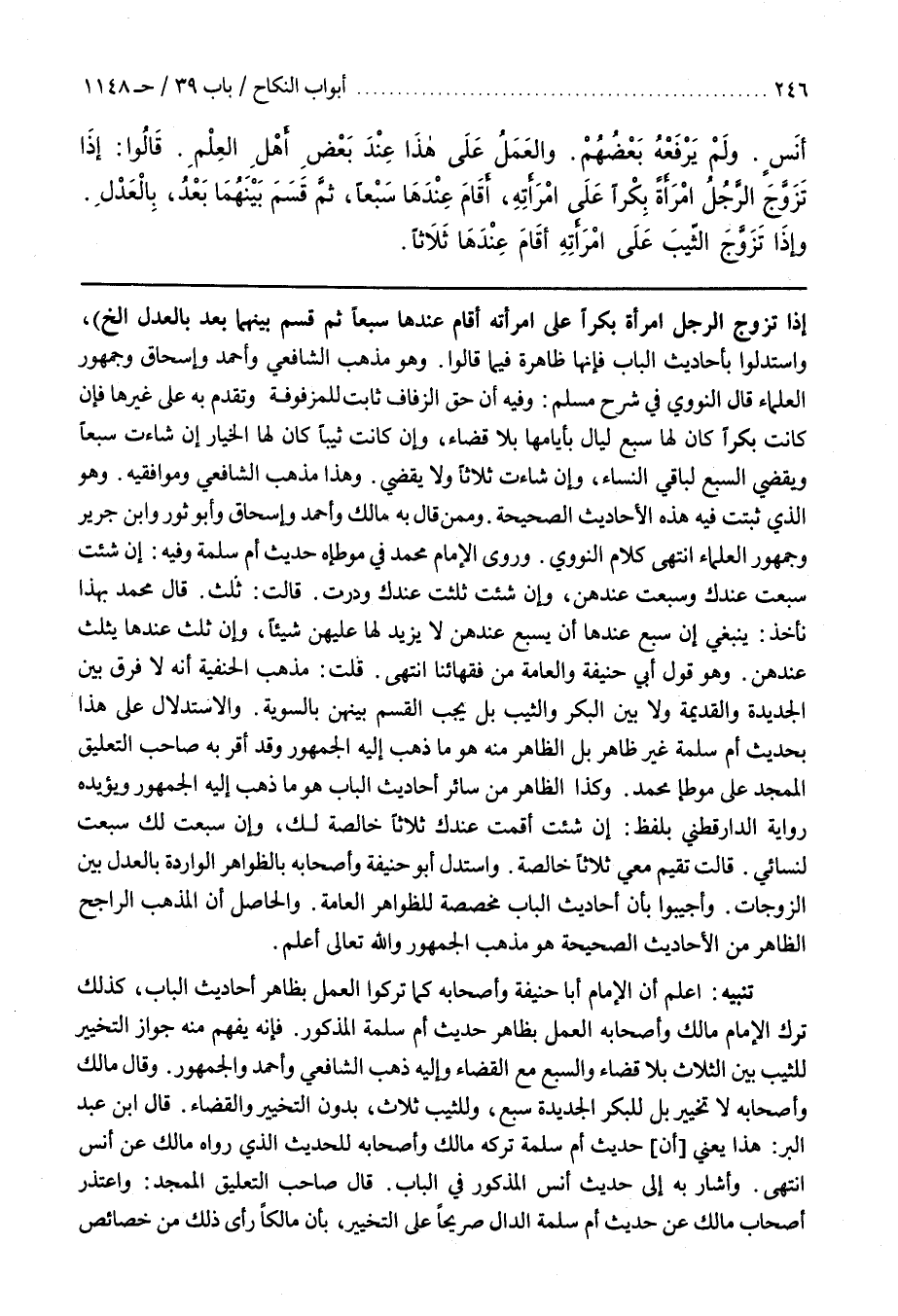 وكَذَا الظَّاهِرُ مِنْ سَائِرِ أَحَادِيثِ الْبَابِ هُوَ مَا ذَهَبَ إِلَيْهِ الْجُمْهُورُ وَيُؤَيِّدُهُ رِوَايَةُ الدَّارَقُطْنِيِّ بِلَفْظِ إِنْ شِئْتِ أَقَمْتُ عِنْدَكِ ثَلَاثًا خَالِصَةً لَكِ وَإِنْ سَبَّعْتُ لَكِ سَبَّعْتُ لِنِسَائِي