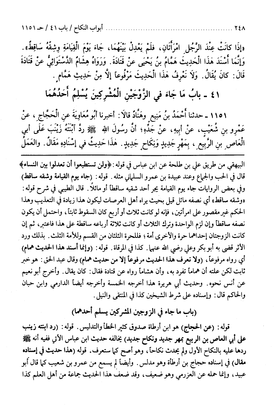 قَوْلُهُ (رَدَّ ابْنَتَهُ زَيْنَبَ عَلَى أَبِي الْعَاصِ بْنِ الرَّبِيعِ بمهر جديد ونكاح جديد) يخالفه حديث بن عَبَّاسٍ الْآتِي فَفِيهِ أَنَّهُ صَلَّى اللَّهُ عَلَيْهِ وَسَلَّمَ رَدَّهَا عَلَيْهِ بِالنِّكَاحِ الْأَوَّلِ وَلَمْ يُحْدِثْ نِكَاحًا وَهُوَ أَصَحُّ كَمَا سَتَعْرِفُ قَوْلُهُ (هَذَا حَدِيثٌ فِي إِسْنَادِهِ مَقَالٌ فِي إِسْنَادِهِ حَجَّاجُ بْنُ أَرْطَاةَ وَهُوَ مُدَلِّسٌ)