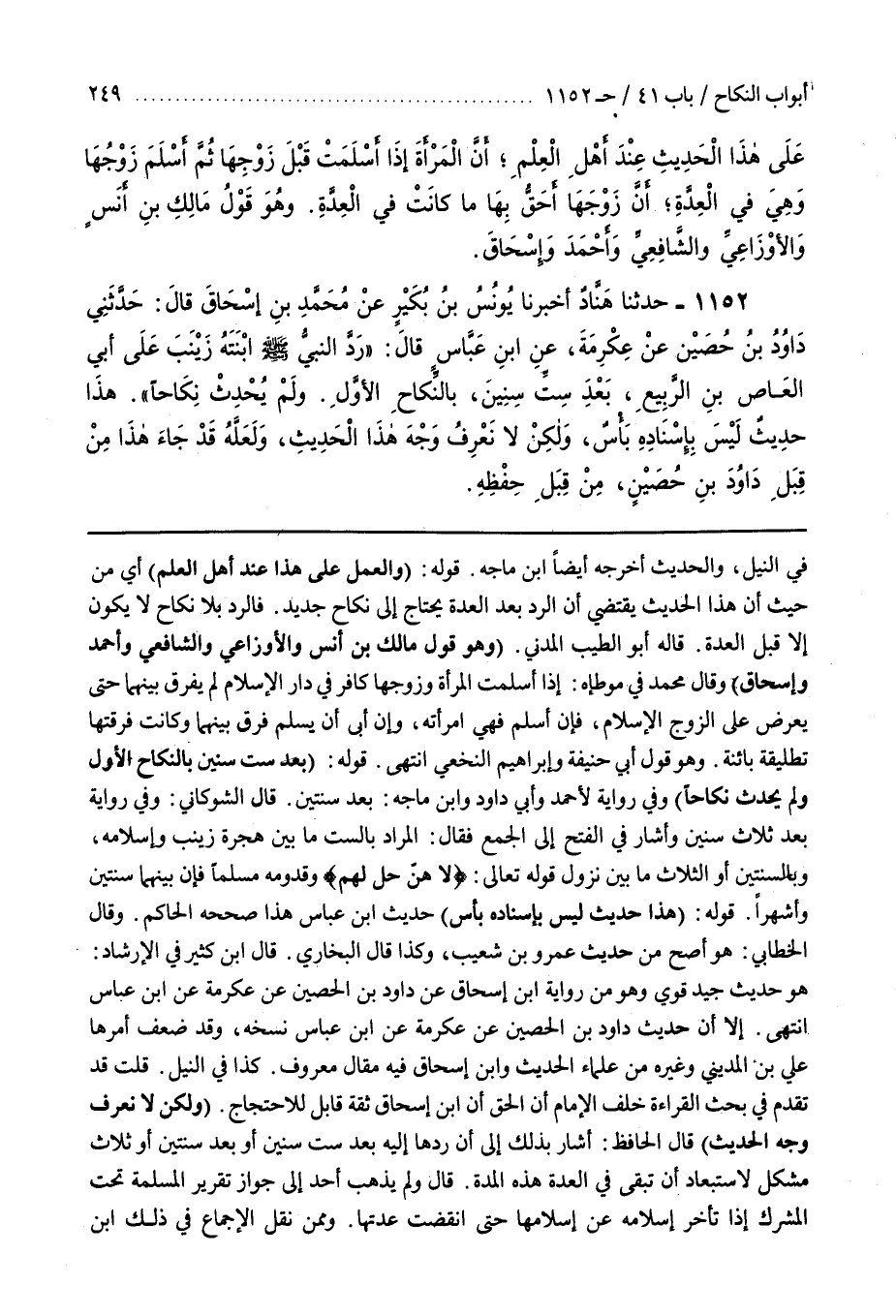 وهُوَ قَوْلُ أَبِي حَنِيفَةَ وَإِبْرَاهِيمَ النَّخَعِيِّ انْتَهَى [1143] قَوْلُهُ (بَعْدَ سِتِّ سِنِينَ بِالنِّكَاحِ الْأَوَّلِ وَلَمْ يُحْدِثْ نِكَاحًا وفِي رِوَايَةٍ لِأَحْمَدَ وأبي داود وبن مَاجَهْ بَعْدَ سَنَتَيْنِ قَالَ الشَّوْكَانِيُّ) وفِي رِوَايَةٍ بَعْدَ ثَلَاثِ سِنِينَ وَأَشَارَ فِي الْفَتْحِ إِلَى الجمع فقال الْمُرَادُ بِالسِّتِّ مَا بَيْنَ هِجْرَةِ زَيْنَبَ وَإِسْلَامِهِ وَبِالسَّنَتَيْنِ أَوْ الثَّلَاثِ مَا بَيْنَ نُزُولِ قَوْلِهِ تعالى لاهن حل لهم وَقُدُومِهِ مُسْلِمًا فَإِنَّ بَيْنَهُمَا سَنَتَيْنِ وَأَشْهُرًا