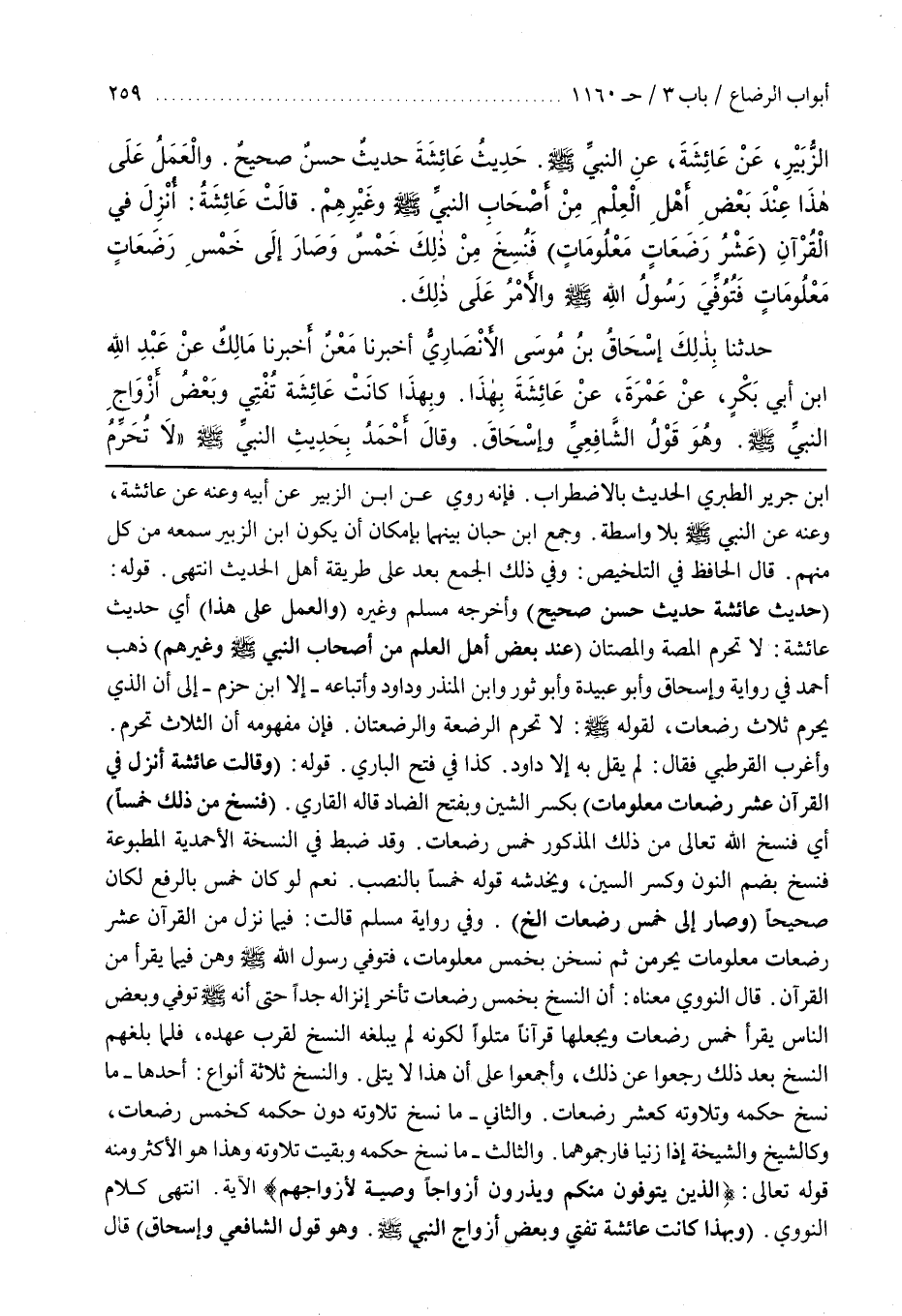 قَالَ النَّوَوِيُّ مَعْنَاهُ أَنَّ النَّسْخَ بِخَمْسِ رَضَعَاتٍ تَأَخَّرَ إِنْزَالُهُ جِدًّا حَتَّى أَنَّهُ صَلَّى اللَّهُ عَلَيْهِ وَسَلَّمَ تُوفِّيَ وَبَعْضُ النَّاسِ يَقْرَأُ خَمْسَ رَضَعَاتٍ وَيجْعَلُهَا قُرْآنًا مَتْلُوًّا لِكَوْنِهِ لَمْ يَبْلُغْهُ النَّسْخُ لِقُرْبِ عَهْدِهِ فَلَمَّا بَلَغَهُمْ النَّسْخُ بَعْدَ ذَلِكَ رَجَعُوا عَنْ ذَلِكَ وَأَجْمَعُوا عَلَى أَنَّ هَذَا لَا يُتْلَى