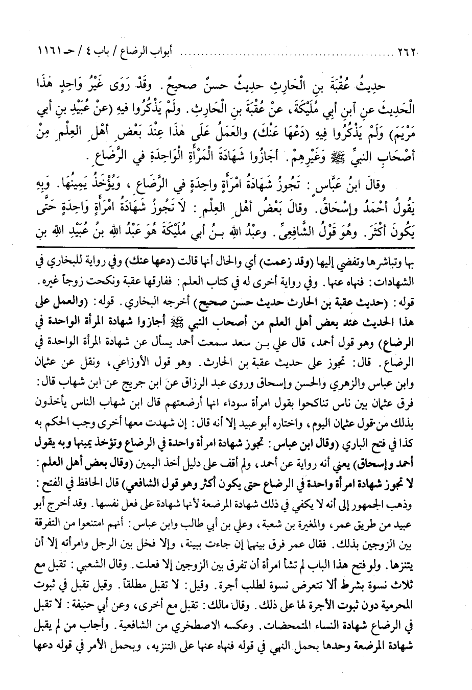 وإِنْ شَهِدَتْ مَعَهَا أُخْرَى وَجَبَ الْحُكْمُ بِهِ كذا في فتح الباري (وقال بن عَبَّاسٍ تَجُوزُ شَهَادَةُ امْرَأَةٍ وَاحِدَةٍ فِي الرَّضَاعِ وَتُؤْخَذُ يَمِينُهَا وَبِهِ يَقُولُ أَحْمَدُ وَإِسْحَاقُ) يَعْنِي أَنَّهُ رِوَايَةٌ عَنْ أَحْمَدَ وَلَمْ أَقِفْ عَلَى دَلِيلِ أَخْذِ الْيَمِينِ (وَقَالَ بَعْضُ أَهْلِ الْعِلْمِ لَا تَجُوزُ شَهَادَةُ امْرَأَةٍ وَاحِدَةٍ فِي الرَّضَاعِ حَتَّى يَكُونَ أَكْثَرَ وَهُوَ قَوْلُ الشَّافِعِيِّ) قَالَ الْحَافِظُ فِي الْفَتْحِ وَذَهَبَ الْجُمْهُورُ إِلَى أَنَّهُ لَا يَكْفِي فِي ذَلِكَ شَهَادَةُ الْمُرْضِعَةِ لِأَنَّهَا شَهَادَةٌ عَلَى فِعْلِ نَفْسِهَا