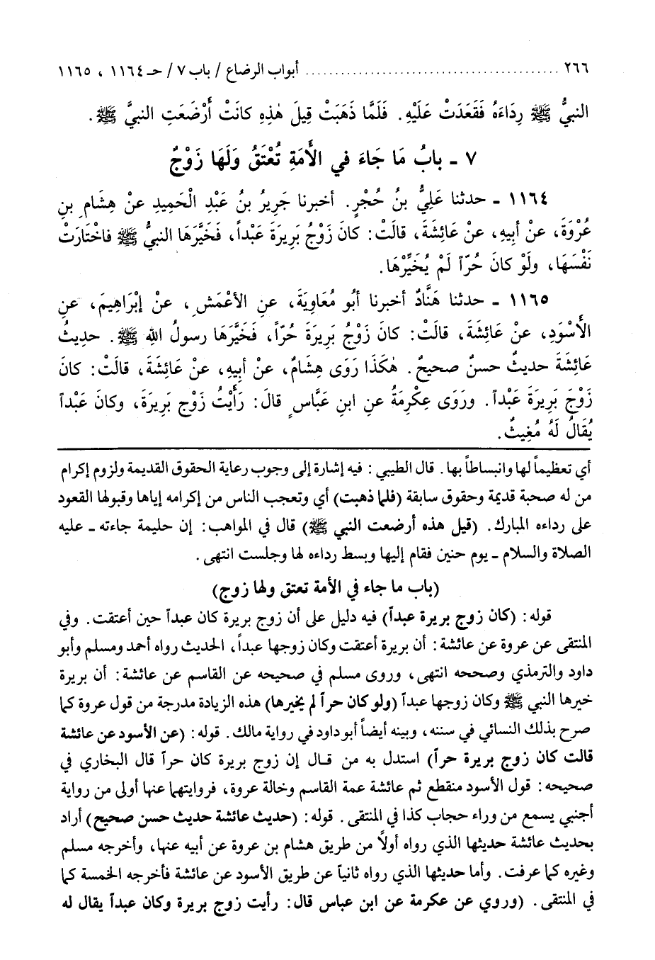 وفِي الْمُنْتَقَى عَنْ عُرْوَةَ عَنْ عَائِشَةَ أَنَّ بَرِيرَةَ أُعْتِقَتْ وَكَانَ زَوْجُهَا عَبْدًا الْحَدِيثُ رَوَاهُ أَحْمَدُ وَمُسْلِمٌ وَأَبُو دَاوُدَ وَالتِّرْمِذِيُّ وَصَحَّحَهُ انْتَهَى