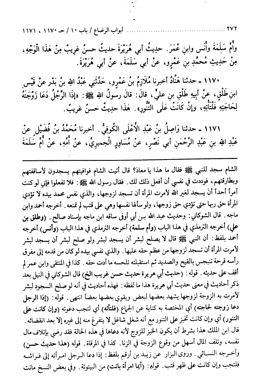 قَوْلُهُ (حَدِيثُ أَبِي هُرَيْرَةَ حَدِيثٌ حَسَنٌ غَرِيبٌ إِلَخْ) قَالَ الشَّوْكَانِيُّ فِي النَّيْلِ بَعْدَ ذِكْرِ أَحَادِيثَ فِي مَعْنَى حَدِيثِ أَبِي هُرَيْرَةَ هَذَا مَا لَفْظُهُ فَهَذِهِ أَحَادِيثُ فِي أَنَّهُ لَوْ صَلُحَ السُّجُودُ لِبَشَرٍ لَأُمِرَتْ بِهِ الزَّوْجَةَ لِزَوْجِهَا يَشْهَدُ بَعْضُهَا لِبَعْضٍ وَيُقَوِّي بَعْضُهَا بَعْضًا انْتَهَى