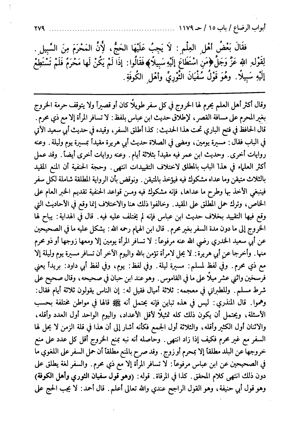 وقَدْ صَرَّحَ بِالْمَنْعِ مُطْلَقًا أَنَّ حَمْلَ السَّفَرِ على اللغوي ما في الصحيحين عن بن عَبَّاسٍ مَرْفُوعًا لَا تُسَافِرِ الْمَرْأَةُ إِلَّا مَعَ ذِي مَحْرَمٍ