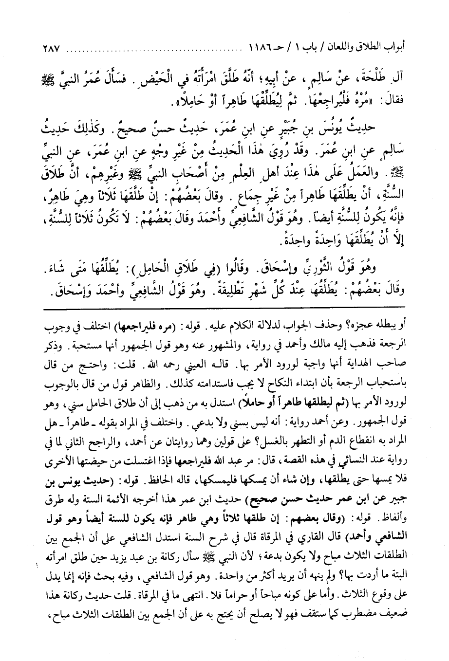 [1176] قَوْلُهُ (مُرْهُ فَلْيُرَاجِعْهَا) اخْتُلِفَ فِي وُجُوبِ الرَّجْعَةِ فَذَهَبَ إِلَيْهِ مَالِكٌ وَأَحْمَدُ فِي رِوَايَةٍ وَالْمَشْهُورُ عَنْهُ وَهُوَ قَوْلُ الْجُمْهُورِ أَنَّهَا مُسْتَحَبَّةٌ