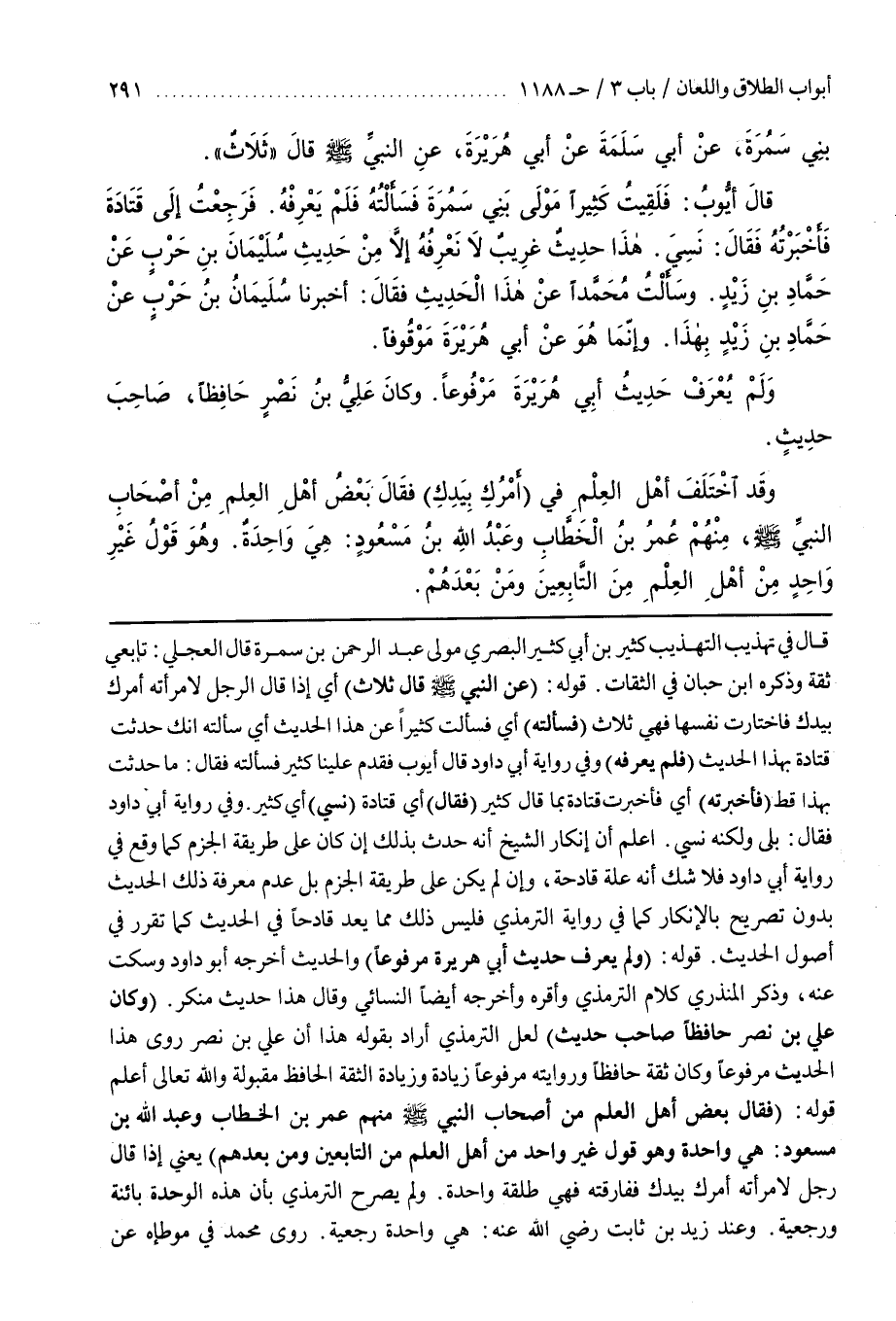 (وَكَانَ عَلِيُّ بْنُ نَصْرٍ حَافِظًا صَاحِبَ حَدِيثٍ) لَعَلَّ التِّرْمِذِيَّ أَرَادَ بِقَوْلِهِ هَذَا أَنَّ عَلِيَّ بْنَ نَصْرٍ رَوَى هَذَا الْحَدِيثَ مَرْفُوعًا وَكَانَ ثِقَةً حَافِظًا وَرِوَايَتُهُ مَرْفُوعًا زِيَادَةٌ وَزِيَادَةُ الثِّقَةِ الْحَافِظِ مَقْبُولَةٌ وَاللَّهُ تَعَالَى أَعْلَمُ قَوْلُهُ (فَقَالَ بَعْضُ أَهْلِ الْعِلْمِ مِنْ أَصْحَابِ النَّبِيِّ صَلَّى اللَّهُ عَلَيْهِ وَسَلَّمَ مِنْهُمْ عُمَرُ بْنُ الْخَطَّابِ وَعَبْدُ اللَّهِ بْنُ مَسْعُودٍ هِيَ وَاحِدَةٌ وَهُوَ قَوْلُ غَيْرِ وَاحِدٍ مِنْ أَهْلِ الْعِلْمِ مِنَ التَّابِعِينَ وَمَنْ بَعْدَهُمْ) يَعْنِي إِذَا قَالَ رَجُلٌ لِامْرَأَتِهِ أَمْرُكِ بِيَدِكِ فَفَارَقَتْهُ فَهِيَ طَلْقَةٌ وَاحِدَةٌ
