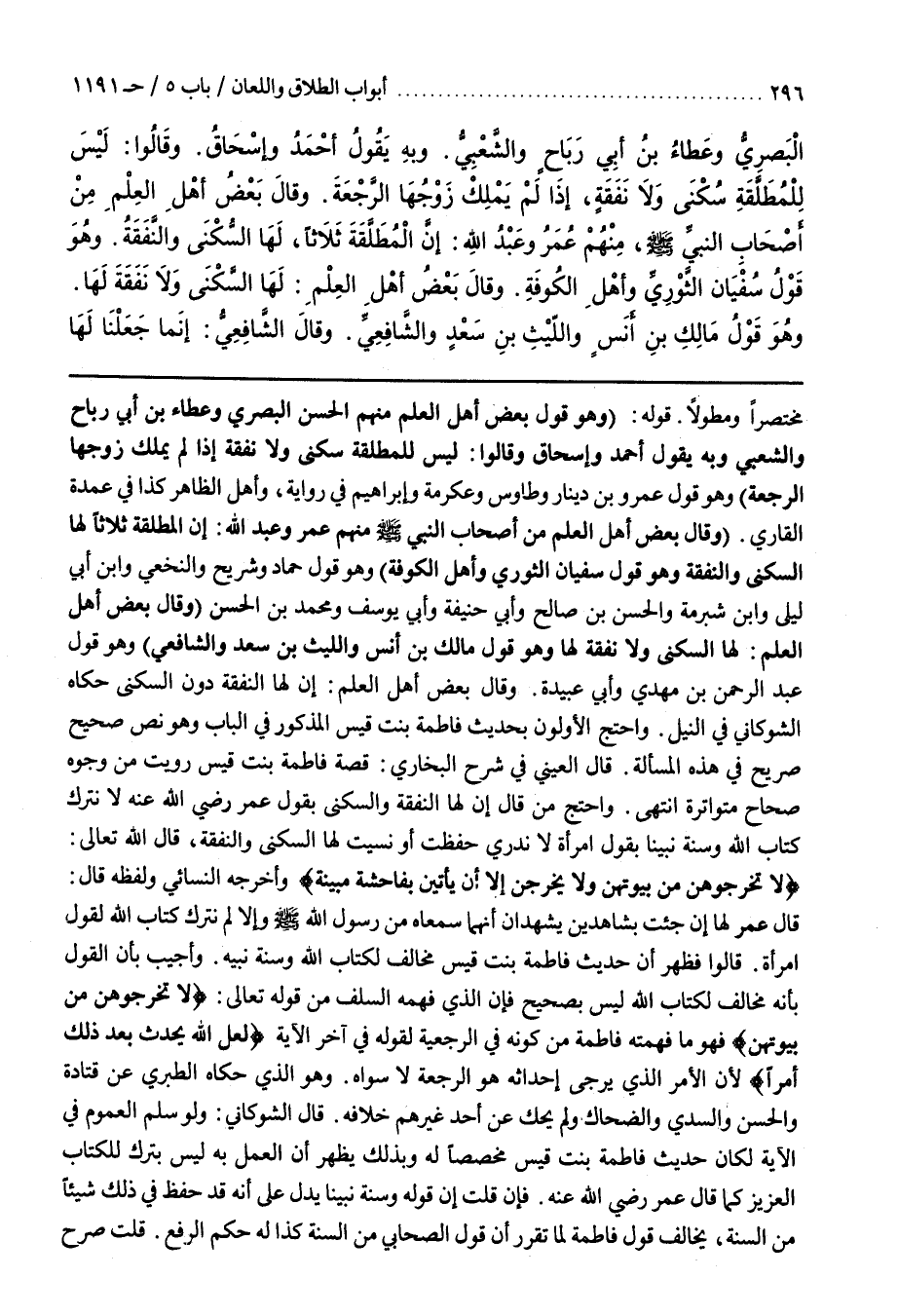 (وَقَالَ بَعْضُ أَهْلِ الْعِلْمِ مِنْ أَصْحَابِ النَّبِيِّ صَلَّى اللَّهُ عَلَيْهِ وَسَلَّمَ مِنْهُمْ عُمَرُ وَعَبْدُ اللَّهِ إِنَّ الْمُطَلَّقَةَ ثَلَاثًا لَهَا السُّكْنَى وَالنَّفَقَةُ وَهُوَ قَوْلُ سُفْيَانَ الثَّوْرِيِّ وَأَهْلِ الْكُوفَةِ) وَهُوَ قول حماد وشريح والنخعي وبن أبي ليلى وبن شُبْرُمَةَ وَالْحَسَنِ بْنِ صَالِحٍ وَأَبِي حَنِيفَةَ وَأَبِي يُوسُفَ وَمُحَمَّدِ بْنِ الْحَسَنِ (وَقَالَ بَعْضُ أَهْلِ الْعِلْمِ لَهَا السُّكْنَى وَلَا نَفَقَةَ لَهَا وَهُوَ قَوْلُ مَالِكِ بْنِ أَنَسٍ وَاللَّيْثِ بْنِ سَعْدٍ وَالشَّافِعِيِّ) وَهُوَ قَوْلُ عَبْدِ الرَّحْمَنِ بْنِ مَهْدِيٍّ وَأَبِي عُبَيْدَةَ