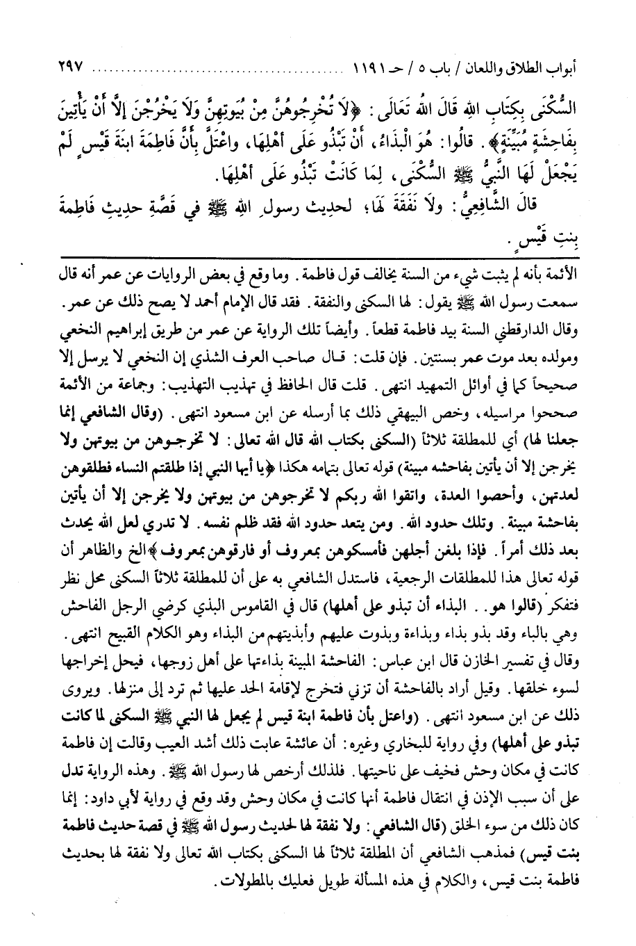 (وَاعْتُلَّ بِأَنَّ فَاطِمَةَ ابْنَةَ قَيْسٍ لَمْ يَجْعَلْ لَهَا النَّبِيُّ صَلَّى اللَّهُ عَلَيْهِ وَسَلَّمَ السُّكْنَى لَمَّا كَانَتْ تَبْذُو عَلَى أَهْلِهَا) وفِي رِوَايَةٍ لِلْبُخَارِيِّ وَغَيْرِهِ أَنَّ عَائِشَةَ عَابَتْ ذَلِكَ أَشَدَّ الْعَيْبِ وَقَالَتْ إِنَّ فَاطِمَةَ كَانَتْ فِي مَكَانٍ وَحِشٍ فَخِيفَ عَلَى نَاحِيَتِهَا فَلِذَلِكَ أَرْخَصَ لَهَا رَسُولُ اللَّهِ صَلَّى اللَّهُ عَلَيْهِ وَسَلَّمَ