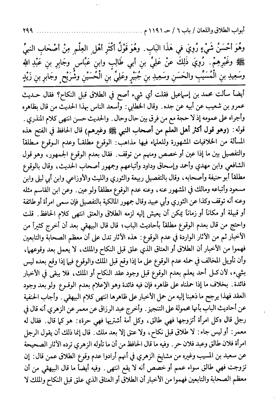وفِيهِ أَيْضًا مَا قَالَ الْبَيْهَقِيُّ مِنْ أَنَّ مُعْظَمَ الصَّحَابَةِ وَالتَّابِعِينَ فَهِمُوا مِنَ الْأَخْبَارِ أَنَّ الطَّلَاقَ أَوْ الْعَتَاقَ الَّذِي عُلِّقَ قَبْلَ النِّكَاحِ والملك لا