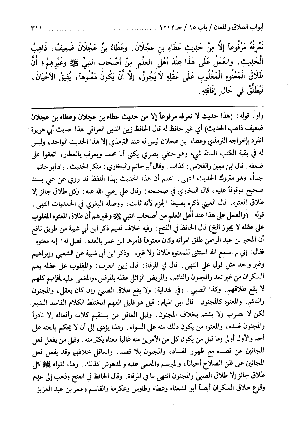 قَوْلُهُ (وَالْعَمَلُ عَلَى هَذَا عِنْدَ أَهْلِ الْعِلْمِ مِنْ أَصْحَابِ النَّبِيِّ صَلَّى اللَّهُ عَلَيْهِ وَسَلَّمَ وَغَيْرِهِمْ أَنَّ طَلَاقَ الْمَعْتُوهِ الْمَغْلُوبِ عَلَى عَقْلِهِ لَا يَجُوزُ إِلَخْ) قَالَ الْحَافِظُ في الفتح وفيه خلاف قديم ذكر بن أبي شيبة من طريق نافع أن المحير بْنَ عَبْدِ الرَّحْمَنِ طَلَّقَ امْرَأَتَهُ وَكَانَ مَعْتُوهًا فأمرها بن عُمَرَ بِالْعِدَّةِ